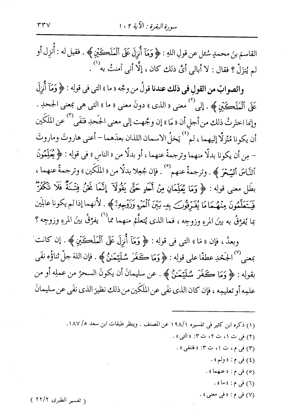 الْقَاسِمَ بْنَ مُحَمَّدٍ: " سُئِلَ عَنْ قَوْلِ اللَّهِ تَعَالَى ذِكْرُهُ: {§وَمَا أُنْزِلَ عَلَى الْمَلَكَيْنِ} [البقرة: 102] فَقِيلَ لَهُ: أُنْزِلَ أَوْ لَمْ يُنْزَلْ؟ فَقَالَ: لَا أُبَالِي أَيَّ ذَلِكَ كَانَ، إِلَّا أَنِّي آمَنْتُ بِهِ " وَالصَّوَابُ مِنَ الْقَوْلِ فِي ذَلِكَ عِنْدِي قَوْلُ مَنْ وَجَّهَ مَا الَّتِي فِي قَوْلِهِ: {وَمَا أُنْزِلَ عَلَى الْمَلَكَيْنِ} [البقرة: 102] إِلَى مَعْنَى الَّذِي دُونَ مَعْنَى مَا الَّتِي هِيَ بِمَعْنَى الْجَحْدِ. وَإِنَّمَا اخْتَرْتُ ذَلِكَ مِنْ أَجْلِ أَنَّ مَا إِنْ وُجِّهَتْ إِلَى مَعْنَى الْجَحْدِ، فَتَنْفِي عَنِ الْمَلَكَيْنِ أَنْ يَكُونَا مُنَزَّلًا إِلَيْهِمَا. وَلَمْ يَخْلُ الِاسْمَانِ اللَّذَانِ بَعْدَهُمَا أَعْنِي هَارُوتَ وَمَارُوتَ مِنْ أَنْ يَكُونَا بَدَلًا مِنْهُمَا وَتَرْجَمَةً عَنْهُمَا، أَوْ بَدَلًا مِنَ النَّاسِ فِي قَوْلِهِ: {يُعَلِّمُونَ النَّاسَ السِّحْرَ} [البقرة: 102] وَتَرْجَمَةً عَنْهُمَا. فَإِنْ جُعِلًا بَدَلًا مِنَ الْمَلَكَيْنِ وَتَرْجَمَةً عَنْهُمَا بَطَلَ مَعْنَى قَوْلِهِ: {وَمَا يُعَلِّمَانِ مِنْ أَحَدٍ حَتَّى يَقُولَا إِنَّمَا نَحْنُ فِتْنَةٌ فَلَا تَكْفُرْ فَيَتَعَلَّمُونَ مِنْهُمَا مَا يُفَرِّقُونَ بِهِ بَيْنَ الْمَرْءِ وَزَوْجِهِ} [البقرة: 102] لِأَنَّهُمَا إِذَا لَمْ يَكُونَا عَالِمَيْنِ بِمَا يُفَرَّقُ بِهِ بَيْنَ الْمَرْءِ وَزَوْجِهِ، فَمَا الَّذِي يَتَعَلَّمُ مِنْهُمَا مَنْ يُفَرِّقُ بَيْنَ الْمَرْءِ وَزَوْجِهِ؟ وَبَعْدُ، فَإِنَّ مَا الَّتِي فِي قَوْلِهِ: {وَمَا أُنْزِلَ عَلَى الْمَلَكَيْنِ} [البقرة: 102] إِنْ كَانَتْ فِي مَعْنَى الْجَحْدِ عَطْفًا عَلَى قَوْلِهِ: {وَمَا كَفَرَ سُلَيْمَانَ} [البقرة: 102] فَإِنَّ اللَّهَ جَلَّ ثَنَاؤُهُ نَفَى بِقَوْلِهِ: {وَمَا كَفَرَ سُلَيْمَانَ} [البقرة: 102] عَنْ سُلَيْمَانَ أَنْ يَكُونَ السِّحْرُ مِنْ عَمَلِهِ، أَوْ مِنْ عِلْمِهِ أَوْ تَعْلِيمِهِ. فَإِنْ كَانَ الَّذِي نَفَى عَنِ الْمَلَكَيْنِ مِنْ ذَلِكَ نَظِيرُ الَّذِي نَفَى عَنْ سُلَيْمَانَ