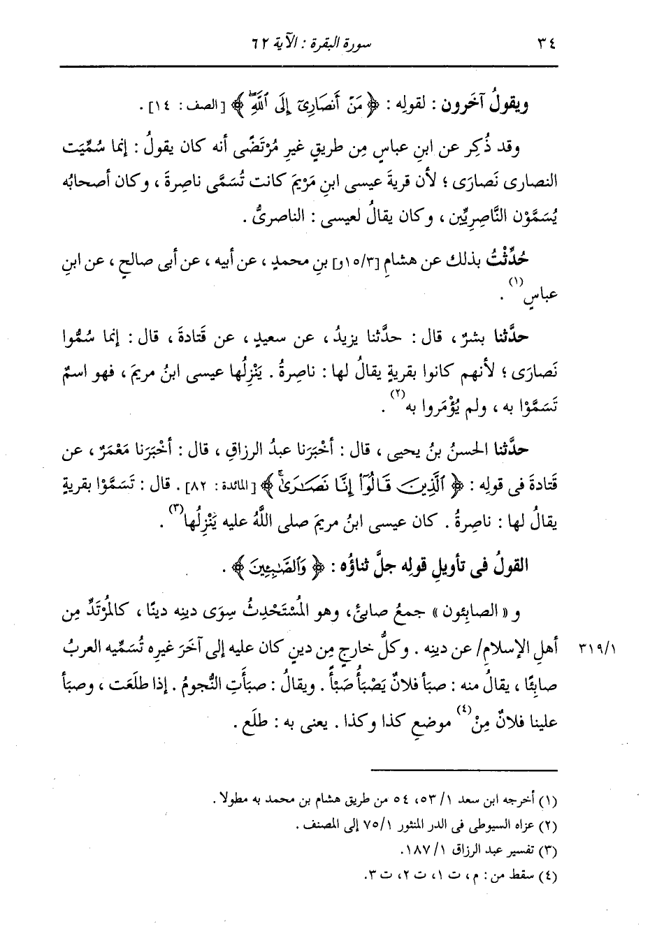 §الْقَوْلُ فِي تَأْوِيلِ قَوْلِهِ تَعَالَى: {وَالصَّابِئِينَ} [البقرة: 62] قَالَ أَبُو جَعْفَرٍ: وَالصَّابِئُونَ جَمْعُ صَابِئٍ، وَهُوَ الْمُسْتَحْدِثُ سِوَى دِينِهِ دِينًا، كَالْمُرْتَدِّ مِنْ أَهْلِ الْإِسْلَامِ عَنْ دِينِهِ وَكُلُّ خَارِجٍ مِنْ دِينٍ كَانَ عَلَيْهِ إِلَى آخَرَ غَيْرِهِ تُسَمِّيهِ الْعَرَبُ صَابِئًا، يُقَالُ مِنْهُ: صَبَأَ فُلَانٌ يَصْبَأُ صَبَأَ، وَيُقَالُ: صَبَأَتِ النُّجُومُ: إِذَا طَلَعَتْ، وَصَبَأَ عَلَيْنَا فُلَانٌ مَوْضِعَ كَذَا وَكَذَا، يَعْنِي بِهِ طَلَعَ. -[35]- وَاخْتَلَفَ أَهْلُ التَّأْوِيلِ فِيمَنْ يَلْزَمُهُ هَذَا الِاسْمُ مِنْ أَهْلِ الْمِلَلِ. فَقَالَ بَعْضُهُمْ: يَلْزَمُ ذَلِكَ كُلَّ مَنْ خَرَجَ مِنْ دِينٍ إِلَى غَيْرِ دِينٍ. وَقَالُوا: الَّذِينَ عَنَى اللَّهُ بِهَذَا الِاسْمِ قَوْمٌ لَا دِينَ لَهُمْ