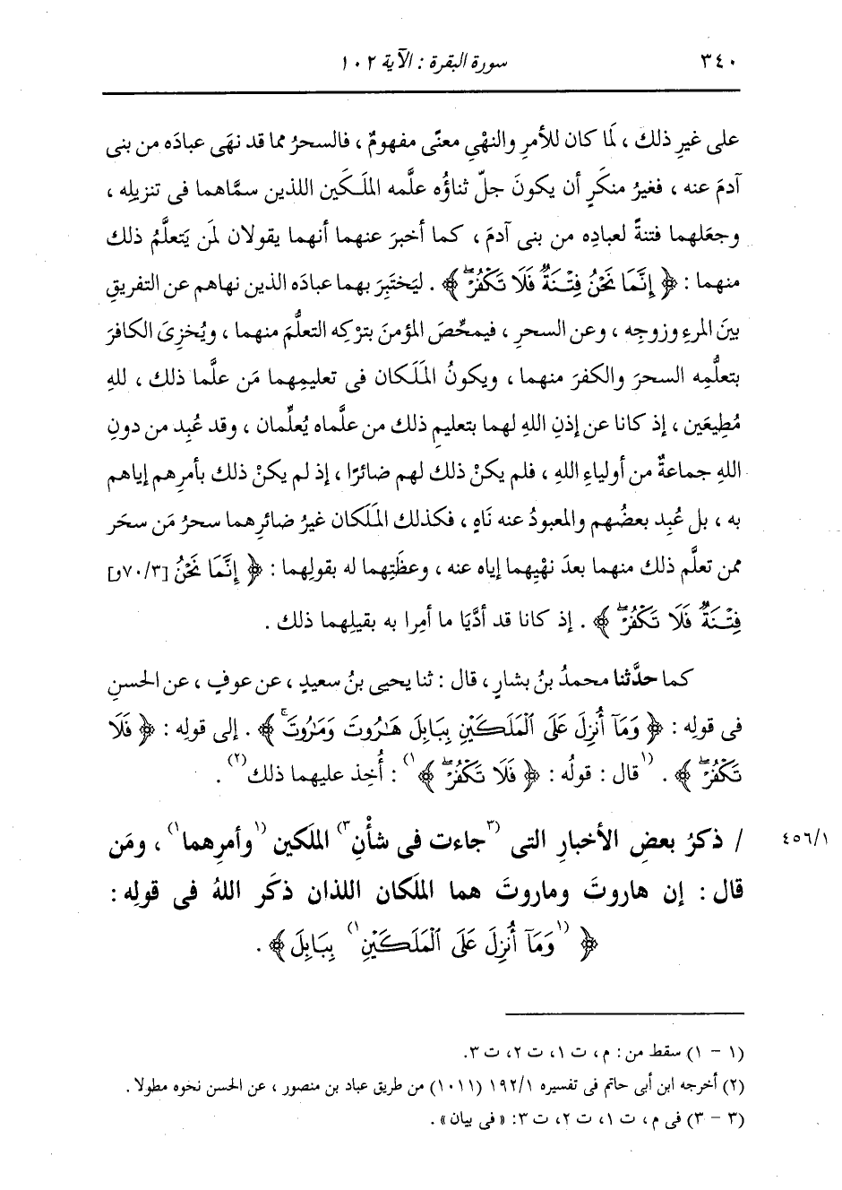 عَلَى غَيْرِ ذَلِكَ، لَمَا كَانَ لِلْأَمْرِ وَالنَّهْيِ مَعْنًى مَفْهُومٌ؛ فَالسِّحْرُ مِمَّا قَدْ نَهَى عِبَادَهُ مِنْ بَنِي آدَمَ عَنْهُ، فَغَيْرُ مُنْكَرٍ أَنْ يَكُونَ جَلَّ ثَنَاؤُهُ عَلَّمَهُ الْمَلَكَيْنِ اللَّذَيْنِ سَمَّاهُمَا فِي تَنْزِيلِهِ وَجَعَلَهُمَا فِتْنَةً لِعِبَادِهِ مِنْ بَنِي آدَمَ كَمَا أَخْبَرَ عَنْهُمَا أَنَّهُمَا يَقُولَانِ لِمَنْ يَتَعَلَّمُ ذَلِكَ مِنْهُمَا: {إِنَّمَا نَحْنُ فِتْنَةٌ فَلَا تَكْفُرْ} [البقرة: 102] لِيَخْتَبِرَ بِهِمَا عِبَادَهُ الَّذِينَ نَهَاهُمْ عَنِ التَّفْرِيقِ بَيْنَ الْمَرْءِ وَزَوْجِهِ وَعَنِ السِّحْرِ، فَيُمَحَّصُ الْمُؤْمِنَ بِتَرْكِهِ التَّعَلُّمَ مِنْهُمَا، وَيُخْزِي الْكَافِرَ بِتَعَلُّمِهِ السِّحْرَ وَالْكُفْرَ مِنْهُمَا، وَيَكُونُ الْمَلَكَانِ فِي تَعْلِيمِهِمَا مَنْ عَلَّمَا ذَلِكَ لِلَّهِ مُطِيعِينَ، إِذْ كَانَا عَنْ إِذْنِ اللَّهِ لَهُمَا بِتَعْلِيمِ ذَلِكَ مَنْ عَلَّمَاهُ يُعَلِّمَانِ. وَقَدْ عُبِدَ مِنِ دُونِ اللَّهِ جَمَاعَةٌ مِنْ أَوْلِيَاءِ اللَّهِ، فَلَمْ يَكُنْ ذَلِكَ لَهُمْ ضَائِرًا إِذْ لَمْ يَكُنْ ذَلِكَ بِأَمْرِهِمْ إِيَّاهُمْ بِهِ، بَلْ عُبِدَ بَعْضُهُمْ وَالْمَعْبُودُ عَنْهُ نَاهٍ، فَكَذَلِكَ الْمَلَكَانِ غَيْرُ ضَائِرِهِمَا سِحْرُ مَنْ سَحَرَ مِمَّنْ تَعَلَّمَ ذَلِكَ مِنْهُمَا بَعْدَ نَهْيِهِمَا إِيَّاهُ عَنْهُ وَعِظَتِهِمَا لَهُ بِقَوْلِهِمَا: {إِنَّمَا نَحْنُ فِتْنَةٌ فَلَا تَكْفُرْ} [البقرة: 102] إِذْ كَانَا قَدْ أَدَّيَا مَا أُمِرَ بِهِ بِقِيلِهِمَا ذَلِكَ