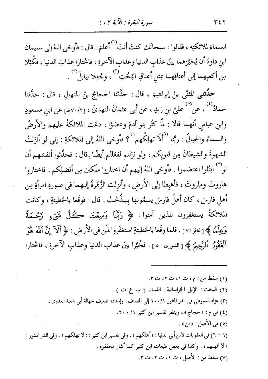 حَدَّثَنِي الْمُثَنَّى، قَالَ: ثَنَا الْحَجَّاجُ بْنُ الْمِنْهَالِ، قَالَ: ثَنَا حَجَّاجٌ، عَنْ عَلِيِّ بْنِ زَيْدٍ، عَنْ أَبِي عُثْمَانَ النَّهْدِيُّ، عَنِ ابْنِ مَسْعُودٍ وَابْنِ عَبَّاسٍ أَنَّهُمَا، قَالَا: " §لَمَّا كَثُرَ بَنُو آدَمَ وَعَصَوْا، دَعَتِ الْمَلَائِكَةُ عَلَيْهِمْ وَالْأَرْضُ وَالسَّمَاءُ وَالْجِبَالُ: رَبَّنَا أَلَا تُهْلِكُهُمْ؟ فَأَوْحَى اللَّهُ إِلَى الْمَلَائِكَةِ: إِنِّي لَوْ أَنْزَلْتُ الشَّهْوَةَ وَالشَّيْطَانَ مِنْ قُلُوبِكُمْ وَنَزَلْتُمْ لَفَعَلْتُمْ أَيْضًا. قَالَ: فَحَدَّثُوا أَنْفُسُهُمْ أَنْ لَوْ ابْتُلُوا اعْتَصَمُوا. فَأَوْحَى اللَّهُ إِلَيْهِمْ أَنِ اخْتَارُوا مَلَكَيْنِ مِنْ أَفْضَلِكُمْ. فَاخْتَارُوا هَارُوتَ وَمَارُوتَ، فَأُهْبِطَا إِلَى الْأَرْضِ وَأُنْزِلَتِ الزَّهْرَةُ إِلَيْهِمَا فِي صُورَةِ امْرَأَةٍ مِنْ أَهْلِ فَارِسَ، وَكَانَ أَهْلُ فَارِسَ يُسَمُّونَهَا بَيْذَخَتْ قَالَ: فَوَقَعَا بِالْخَطِيئَةِ، فَكَانَتِ الْمَلَائِكَةُ يَسْتَغْفِرُونَ لِلَّذِينَ آمَنُوا. {رَبَّنَا وَسِعْتَ كُلَّ شَيْءٍ رَحْمَةً وَعِلْمًا فَاغْفِرْ لِلَّذِينَ تَابُوا} [غافر: 7] . فَلَمَّا وَقَعَا بِالْخَطِيئَةِ اسْتَغْفَرُوا لِمَنْ فِي الْأَرْضِ: {أَلَا إِنَّ اللَّهَ هُوَ الْغَفُورُ الرَّحِيمُ} [الشورى: 5] فَخُيِّرَا بَيْنَ عَذَابِ الدُّنْيَا وَعَذَابِ الْآخِرَةِ فَاخْتَارَا -[343]- عَذَابَ الدُّنْيَا "