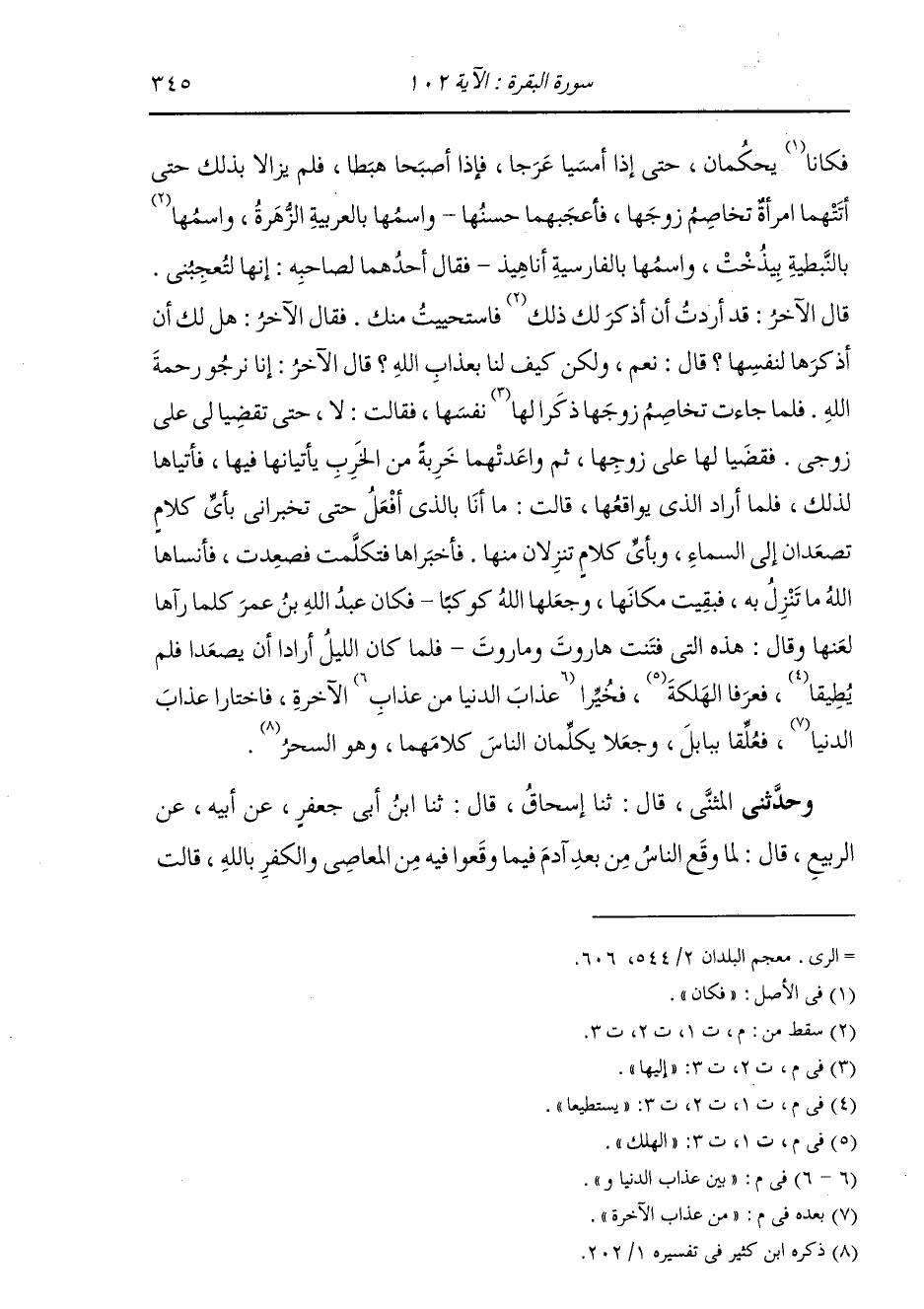 فَكَانَا يَحْكُمَانِ، حَتَّى إِذَا أَمْسَيَا عَرَجَا، فَإِذَا أَصْبَحَا هَبَطَا. فَلَمْ يَزَالَا كَذَلِكَ حَتَّى أَتَتْهُمَا امْرَأَةٌ تُخَاصِمُ زَوْجَهَا، فَأَعْجَبَهُمَا حُسْنُهَا وَاسْمُهَا بِالْعَرَبِيَّةِ الزُّهَرَةُ، وِبَالنَّبَطِيَّةِ بَيْذَخَتْ، وَاسْمُهَا بِالْفَارِسِيَّةِ أَنَاهِيذُ، فَقَالَ أَحَدُهُمَا لِصَاحِبِهِ: إِنَّهَا لَتُعْجِبُنِي. فَقَالَ الْآخَرُ: قَدْ أَرَدْتُ أَنْ أَذْكُرَ لَكَ فَاسْتَحْيَيْتُ مِنْكَ. فَقَالَ الْآخَرُ: هَلْ لَكَ أَنْ أَذْكُرَهَا لِنَفْسِهَا؟ قَالَ: نَعَمْ، وَلَكِنْ كَيْفَ لَنَا بِعَذَابِ اللَّهِ؟ قَالَ الْآخَرُ: إِنَّا نَرْجُو رَحْمَةَ اللَّهِ. فَلَمَّا جَاءَتْ تُخَاصِمُ زَوْجَهَا ذَكَرَا إِلَيْهَا نَفْسَهَا، فَقَالَتْ: لَا، حَتَّى تَقْضِيَا لِي عَلَى زَوْجِي، فَقَضَيَا لَهَا عَلَى زَوْجِهَا. ثُمَّ وَاعَدَتْهُمَا خَرِبَةً مِنَ الْخِرَبِ يَأْتِيَانِهَا فِيهَا، فَأَتَيَاهَا لِذَلِكَ، فَلَمَّا أَرَادَ الَّذِي يُوَاقِعُهَا، قَالَتْ: مَا أَنَا بِالَّذِي أَفْعَلُ حَتَّى تُخْبِرَانِي بِأَيِّ كَلَامٍ تَصْعَدَانِ إِلَى السَّمَاءِ؟ وَبِأَيِّ كَلَامٍ تَنْزِلَانِ مِنْهَا؟ فَأَخْبَرَاهَا فَتَكَلَّمَتْ فَصَعِدَتْ. فَأَنْسَاهَا اللَّهُ مَا تَنْزِلُ بِهِ فَبَقِيَتْ مَكَانَهَا، وَجَعَلَهَا اللَّهُ كَوْكَبًا فَكَانَ عَبْدُ اللَّهِ بْنُ عُمَرَ كُلَّمَا رَآهَا لَعَنَهَا وَقَالَ: هَذِهِ الَّتِي فَتَنَتْ هَارُوتَ وَمَارُوتَ فَلَمَّا كَانَ اللَّيْلُ أَرَادَا أَنْ يَصْعَدَا فَلَمْ يَسْتَطِيعَا فَعَرَفَا الْهُلْكَ، فَخُيِّرَا بَيْنَ عَذَابِ الدُّنْيَا وَالْآخِرَةِ، فَاخْتَارَا عَذَابَ الدُّنْيَا مِنْ عَذَابِ الْآخِرَةِ، فَعُلِّقَا بِبَابِلَ فَجَعَلَا يُكَلِّمَانِ النَّاسَ كَلَامَهُمَا وَهُوَ السِّحْرُ "