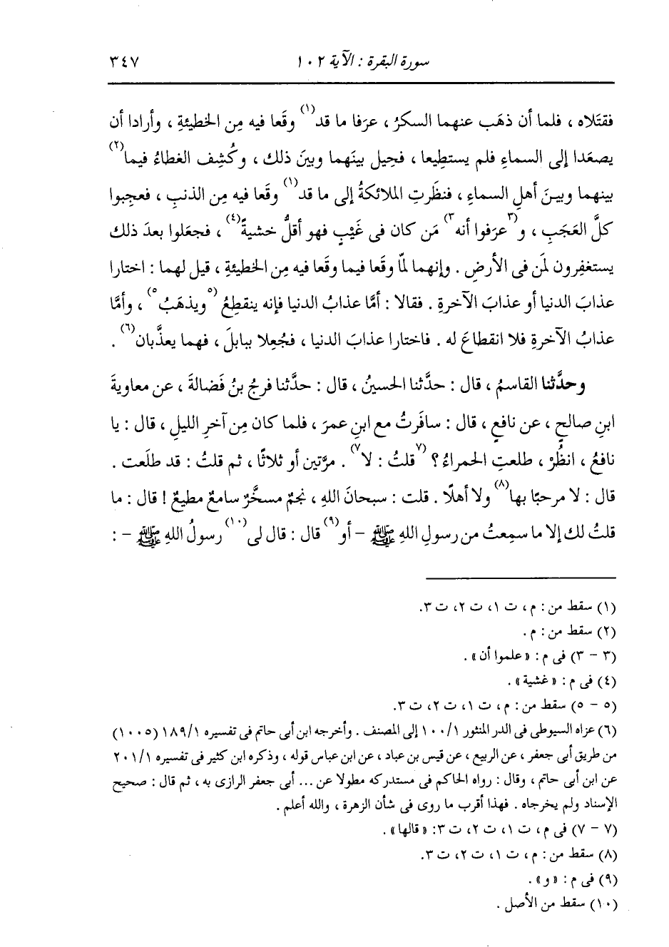 حَدَّثَنَا الْقَاسِمُ، قَالَ: ثَنَا الْحُسَيْنُ، قَالَ: ثَنَا فَرَجُ بْنُ فَضَالَةَ، عَنْ مُعَاوِيَةَ بْنِ صَالِحٍ، عَنْ نَافِعٍ، قَالَ: سَافَرْتُ مَعَ ابْنِ عُمَرَ، فَلَمَّا كَانَ مِنْ آخِرِ اللَّيْلِ، قَالَ: يَا نَافِعُ انْظُرْ طَلَعَتِ الْحَمْرَاءُ. قَالَهَا مَرَّتَيْنِ أَوْ ثَلَاثًا. ثُمَّ قُلْتُ: قَدْ طَلَعَتْ. قَالَ: لَا مَرْحَبًا وَلَا أَهْلًا. قُلْتُ: سُبْحَانَ اللَّهِ نَجْمٌ مُسَخَّرٌ سَامِعٌ مُطِيعٌ؟ قَالَ: مَا قُلْتُ لَكَ إِلَّا مَا سَمِعْتُ مِنْ رَسُولِ اللَّهِ صَلَّى اللهُ عَلَيْهِ وَسَلَّمَ؛ وَقَالَ: قَالَ لِي رَسُولُ اللَّهِ صَلَّى اللهُ عَلَيْهِ وَسَلَّمَ: " -[348]- إِنَّ §الْمَلَائِكَةَ قَالَتْ: يَا رَبِّ كَيْفَ صَبْرُكَ عَلَى بَنِي آدَمَ فِي الْخَطَايَا وَالذُّنُوبِ؟ قَالَ: إِنِّي ابْتَلَيْتُهُمْ وَعَافَيْتُكُمْ. قَالُوا: لَوْ كُنَّا مَكَانَهُمْ مَا عَصَيْنَاكَ. قَالَ: فَاخْتَارُوا مَلَكَيْنِ مِنْكُمْ. قَالَ: فَلَمْ يَأْلُوا أَنْ يَخْتَارُوا، فَاخْتَارُوا هَارُوتَ وَمَارُوتَ "