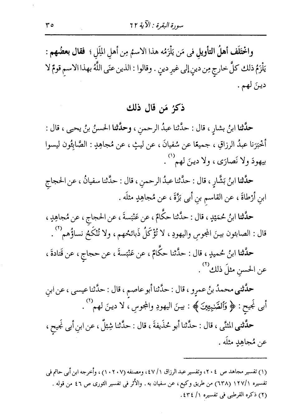 ذِكْرُ مَنْ قَالَ ذَلِكَ حَدَّثَنَا مُحَمَّدُ بْنُ بَشَّارٍ، قَالَ: ثنا عَبْدُ الرَّحْمَنِ بْنُ مَهْدِيٍّ، وَحَدَّثَنَا الْحَسَنُ بْنُ يَحْيَى، قَالَ: أَخْبَرَنَا عَبْدُ الرَّزَّاقِ، جَمِيعًا، عَنْ سُفْيَانَ، عَنْ لَيْثٍ، عَنْ مُجَاهِدٍ، قَالَ: «§الصَّابِئُونَ لَيْسُوا بِيَهُودَ وَلَا نَصَارَى وَلَا دِينَ لَهُمْ» حَدَّثَنَا ابْنُ بَشَّارٍ، قَالَ: ثنا عَبْدُ الرَّحْمَنِ، قَالَ: ثنا سُفْيَانُ، عَنِ الْحَجَّاجِ بْنِ أَرْطَأَةَ، عَنِ الْقَاسِمِ بْنِ أَبِي بَزَّةَ، عَنْ مُجَاهِدٍ، مِثْلَهُ