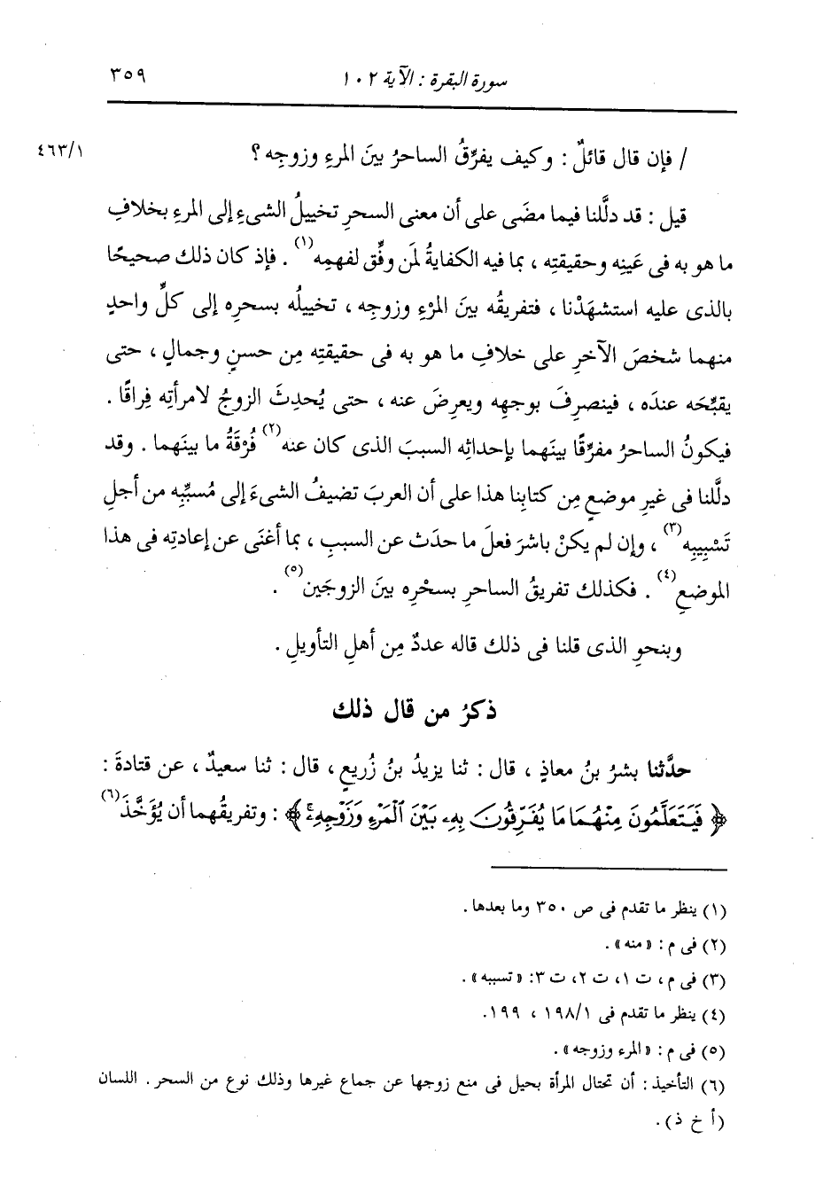فَإِنْ قَالَ قَائِلٌ: وَكَيْفَ يُفَرِّقُ السَّاحِرُ بَيْنَ الْمَرْءِ وَزَوْجِهِ؟ قِيلَ: قَدْ دَلَّلْنَا فِيمَا مَضَى عَلَى أَنَّ مَعْنَى السِّحْرِ تَخْيِيلُ الشَّيْءِ إِلَى الْمَرْءِ بِخِلَافِ مَا هُوَ بِهِ فِي عَيْنِهِ وَحَقِيقَتُهُ بِمَا فِيهِ الْكِفَايَةُ لِمَنْ وُفِّقَ لِفَهْمِهِ. فَإِنْ كَانَ ذَلِكَ صَحِيحًا بِالَّذِي اسْتَشْهَدْنَا عَلَيْهِ، فَتَفْرِيقُهُ بَيْنَ الْمَرْءِ وَزَوْجِهِ تَخْيِيلُهُ بِسِحْرِهِ إِلَى كُلِّ وَاحِدٍ مِنْهُمَا شَخْصَ الْآخَرِ عَلَى خِلَافِ مَا هُوَ بِهِ فِي حَقِيقَتِهِ مِنْ حُسْنٍ وَجَمَالٍ حَتَّى يُقَبِّحَهُ عِنْدَهُ فَيَنْصَرِفَ بِوَجْهِهِ وَيُعْرِضَ عَنْهُ، حَتَّى يُحْدِثَ الزَّوْجُ لِامْرَأَتِهِ فِرَاقًا، فَيَكُونُ السَّاحِرُ مُفَرِّقًا بَيْنَهُمَا بِإِحْدَاثِهِ السَّبَبَ الَّذِي كَانَ مِنْهُ فُرْقَةُ مَا بَيْنَهُمَا. وَقَدْ دَلَّلْنَا فِي غَيْرِ مَوْضِعٍ مِنْ كِتَابِنَا هَذَا عَلَى أَنَّ الْعَرَبَ تُضِيفُ الشَّيْءَ إِلَى مُسَبِّبِهِ مِنْ أَجْلِ تَسَبُّبِهِ، وَإِنْ لَمْ يَكُنْ بَاشَرَ فِعْلَ مَا حَدَثَ عَنِ السَّبَبِ، بِمَا أَغْنَى عَنْ إِعَادَتِهِ فِي هَذَا الْمَوْضِعِ؛ فَكَذَلِكَ تَفْرِيقُ السَّاحِرِ بِسِحْرِهِ بَيْنَ الْمَرْءِ وَزَوْجِهِ. وَبِنَحْوِ الَّذِي قُلْنَا فِي ذَلِكَ قَالَهُ عَدَدٌ مِنْ أَهْلِ التَّأْوِيلِ