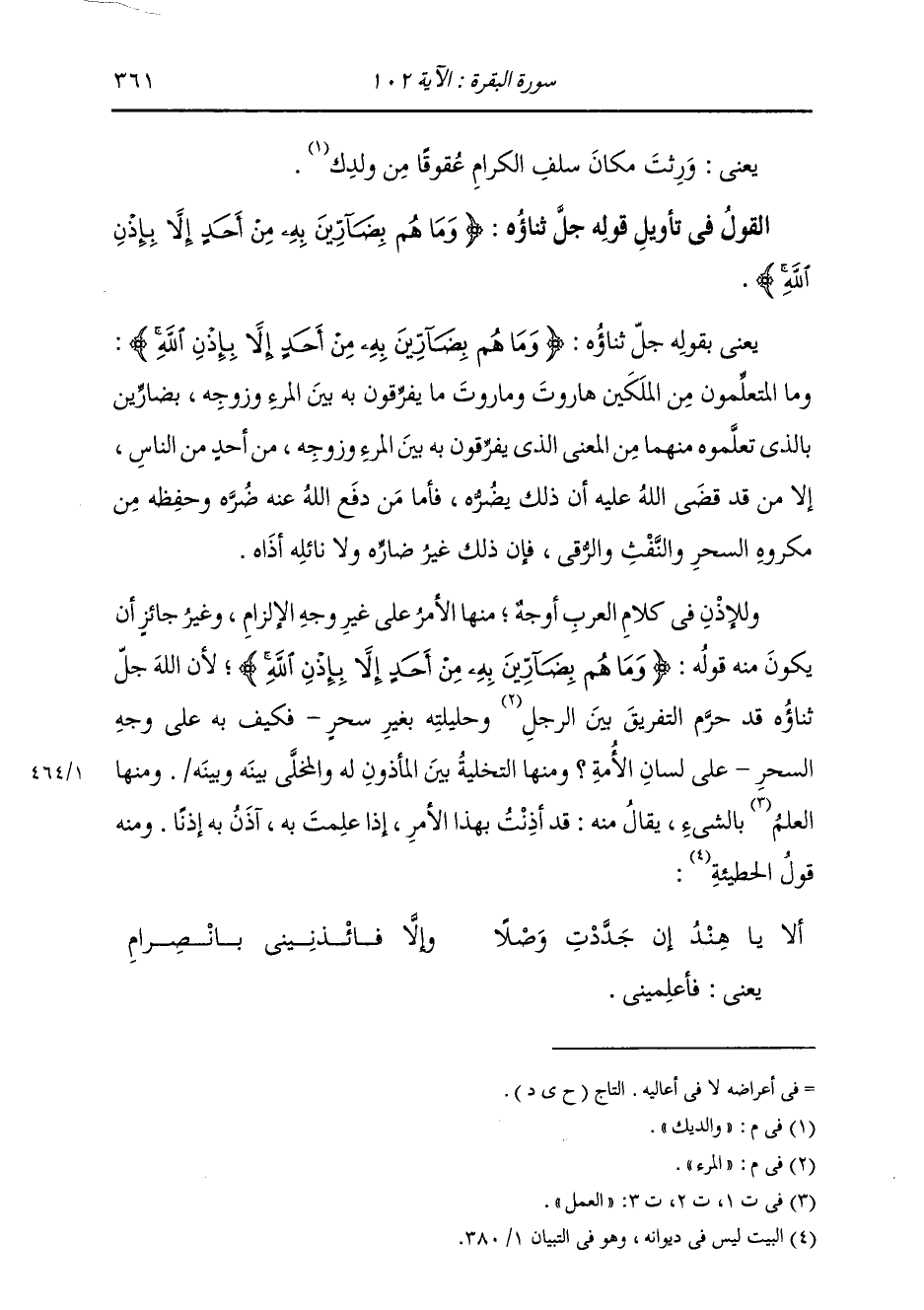 §الْقَوْلُ فِي تَأْوِيلِ قَوْلِهِ تَعَالَى: {وَمَا هُمْ بِضَارِّينَ بِهِ مِنْ أَحَدٍ إِلَّا بِإِذْنِ اللَّهِ} [البقرة: 102] يَعْنِي بِقَوْلِهِ جَلَّ ثَنَاؤُهُ: {وَمَا هُمْ بِضَارِّينَ بِهِ مِنْ أَحَدٍ إِلَّا بِإِذْنِ اللَّهِ} [البقرة: 102] وَمَا الْمُتَعَلِّمُونَ مِنَ الْمَلَكَيْنِ هَارُوتَ وَمَارُوتَ مَا يُفَرِّقُونَ بِهِ بَيْنَ الْمَرْءِ وَزَوْجِهِ، بِضَارِّينَ بِالَّذِي تَعَلَّمُوهُ مِنْهُمَا مِنَ الْمَعْنَى الَّذِي يُفَرِّقُونَ بِهِ بَيْنَ الْمَرْءِ وَزَوْجِهِ مِنْ أَحَدٍ مِنَ النَّاسِ، إِلَّا مَنْ قَدْ قَضَى اللَّهُ عَلَيْهِ أَنَّ ذَلِكَ يَضُرُّهُ؛ فَأَمَّا مَنْ دَفَعَ اللَّهُ عَنْهُ ضُرَّهُ وَحَفِظَهُ مِنْ مَكْرُوهِ السِّحْرِ وَالنَّفْثِ وَالرُّقَى، فَإِنَّ ذَلِكَ غَيْرُ ضَارِّهِ وَلَا نَائِلُهُ أَذَاهُ. وَلِلْإِذْنِ فِي كَلَامِ الْعَرَبِ أَوْجُهٍ: مِنْهَا الْأَمْرُ عَلَى غَيْرِ وَجْهِ الْإِلْزَامِ، وَغَيْرُ جَائِزٍ أَنْ يَكُونَ مِنْهُ قَوْلُهُ: {وَمَا هُمْ بِضَارِّينَ بِهِ مِنْ أَحَدٍ إِلَّا بِإِذْنِ اللَّهِ} [البقرة: 102] لِأَنَّ اللَّهَ جَلَّ ثَنَاؤُهُ قَدْ حَرَّمَ التَّفْرِيقَ بَيْنَ الْمَرْءِ وَحَلِيلَتِهِ بِغَيْرِ سِحْرٍ فَكَيْفَ بِهِ عَلَى وَجْهِ السِّحْرِ عَلَى لِسَانِ الْأُمَّةِ. وَمِنْهَا التَّخْلِيَةُ بَيْنَ الْمَأْذُونِ لَهُ وَالْمُخَلَّى بَيْنَهُ وَبَيْنَهُ. وَمِنْهَا الْعِلْمُ بِالشَّيْءِ، يُقَالُ مِنْهُ: قَدْ أَذِنْتُ بِهَذَا الْأَمْرِ، إِذَا عَلِمْتُ بِهِ، آذَنُ بِهِ إِذْنًا؛ وَمِنْهُ قَوْلُ الْحُطَيْئَةِ: