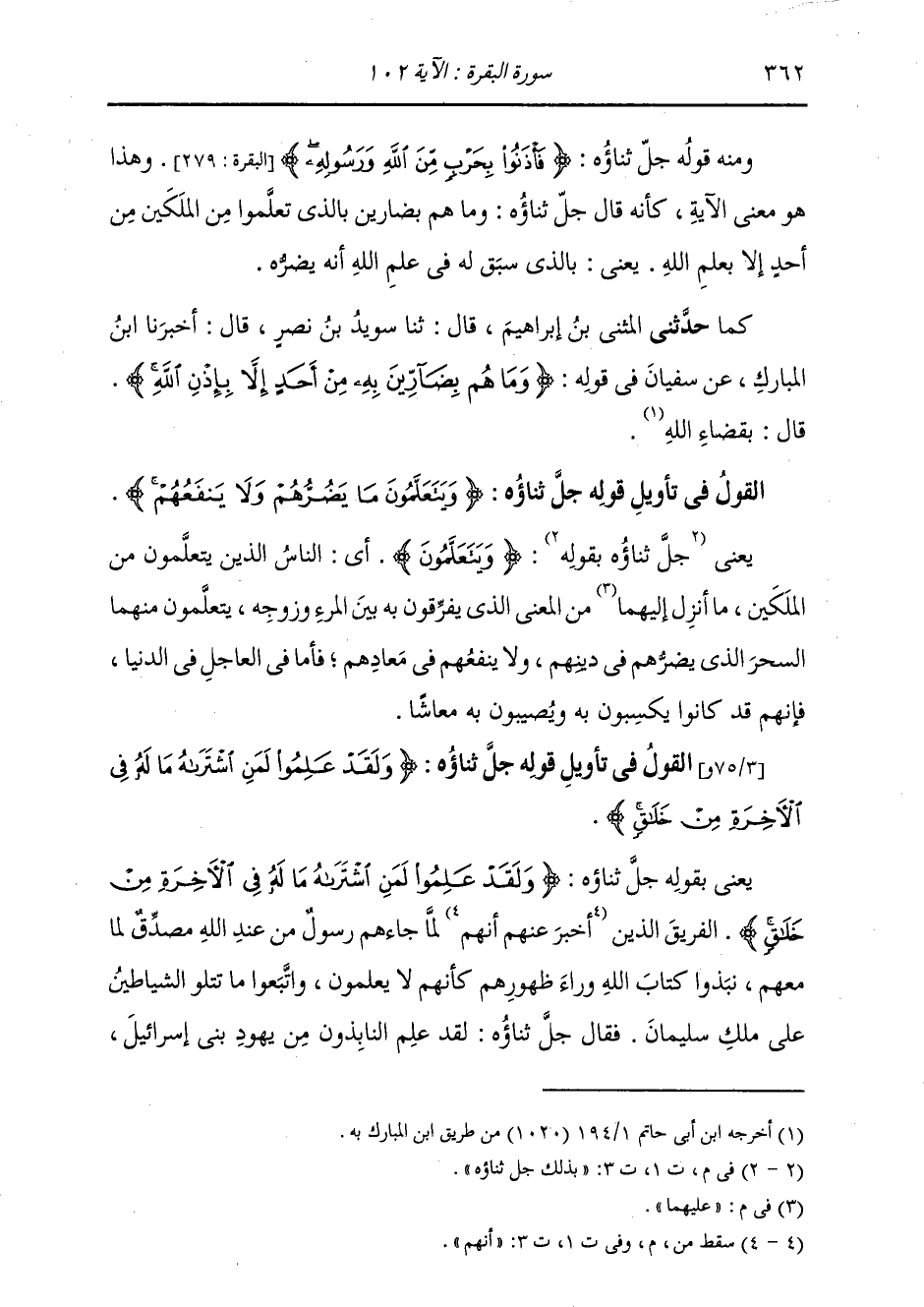 كَمَا حَدَّثَنِي الْمُثَنَّى بْنُ إِبْرَاهِيمَ، قَالَ: ثَنَا سُوَيْدُ بْنُ نَصْرٍ، قَالَ: أَخْبَرَنَا ابْنُ الْمُبَارَكِ، عَنْ سُفْيَانَ: " فِي قَوْلِهِ: {§وَمَا هُمْ بِضَارِّينَ بِهِ مِنْ أَحَدٍ إِلَّا بِإِذْنِ اللَّهِ} [البقرة: 102] قَالَ: بِقَضَاءِ اللَّهِ "