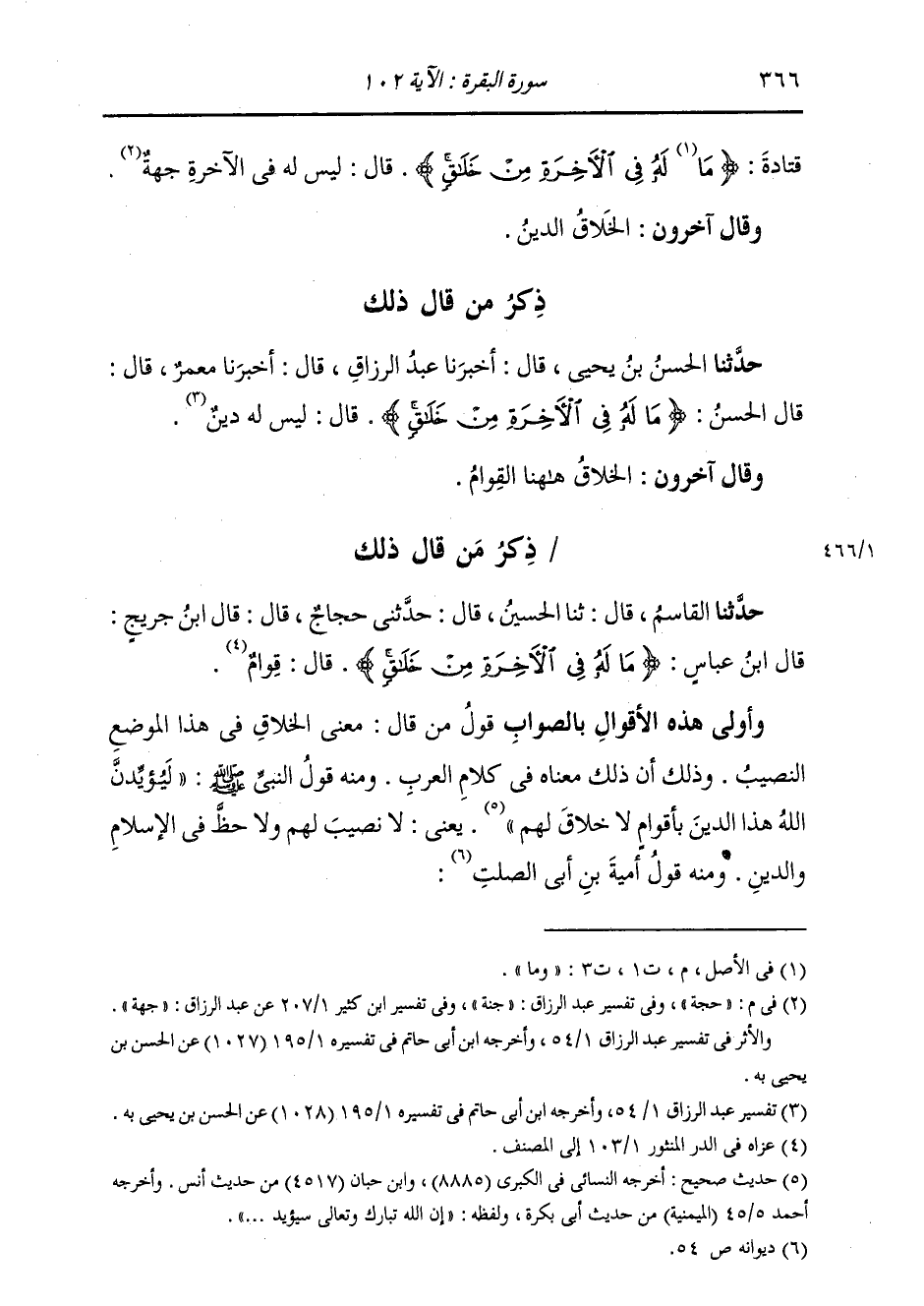 ذِكْرُ مَنْ قَالَ ذَلِكَ حَدَّثَنَا الْقَاسِمُ، قَالَ: ثَنَا الْحُسَيْنُ، قَالَ، حَدَّثَنِي حَجَّاجٌ، قَالَ: قَالَ ابْنُ جُرَيْجٍ: قَالَ ابْنُ عَبَّاسٍ: " {§مَا لَهُ فِي الْآخِرَةِ مِنْ خَلَاقٍ} [البقرة: 102] قَالَ: قِوَامٌ " وَأَوْلَى هَذِهِ الْأَقْوَالِ بِالصَّوَابِ قَوْلُ مَنْ قَالَ: مَعْنَى الْخَلَاقِ فِي هَذَا الْمَوْضِعِ: النَّصِيبُ؛ وَذَلِكَ أَنَّ ذَلِكَ مَعْنَاهُ فِي كَلَامِ الْعَرَبِ. وَمِنْهُ قَوْلُ النَّبِيِّ صَلَّى اللهُ عَلَيْهِ وَسَلَّمَ: «لَيُؤَيِّدَنَّ اللَّهُ هَذَا الدِّينَ بِأَقْوَامٍ لَا خَلَاقَ لَهُمْ» يَعْنِي لَا نَصِيبَ لَهُمْ وَلَا حَظَّ فِي الْإِسْلَامِ وَالدِّينِ. وَمِنْهُ قَوْلُ أُمَيَّةَ بْنِ أَبِي الصَّلْتِ: