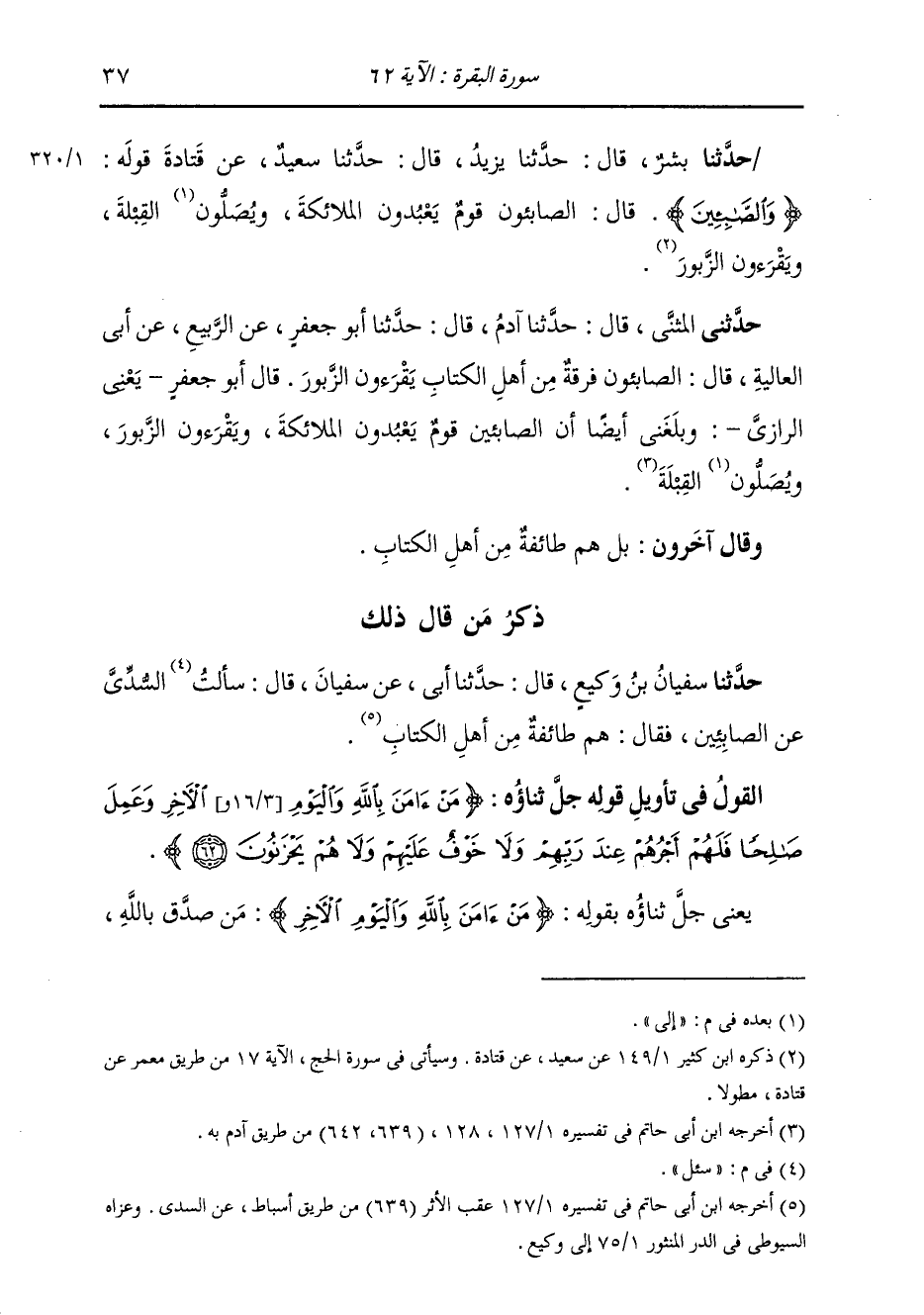 حَدَّثَنِي الْمُثَنَّى، قَالَ: ثنا آدَمُ، ثنا أَبُو جَعْفَرٍ، عَنِ الرَّبِيعِ، عَنْ أَبِي الْعَالِيَةِ، قَالَ: «§الصَّابِئُونَ فِرْقَةٌ مِنْ أَهْلِ الْكِتَابِ يَقْرَءُونَ الزَّبُورَ» قَالَ أَبُو جَعْفَرٍ الرَّازِيُّ: وَبَلَغَنِي أَيْضًا أَنَّ الصَّابِئِينَ قَوْمٌ يَعْبُدُونَ الْمَلَائِكَةَ، وَيَقْرَءُونَ الزَّبُورَ، وَيُصَلُّونَ إِلَى الْقِبْلَةِ وَقَالَ آخَرُونَ: بَلْ هُمْ طَائِفَةٌ مِنْ أَهْلِ الْكِتَابِ