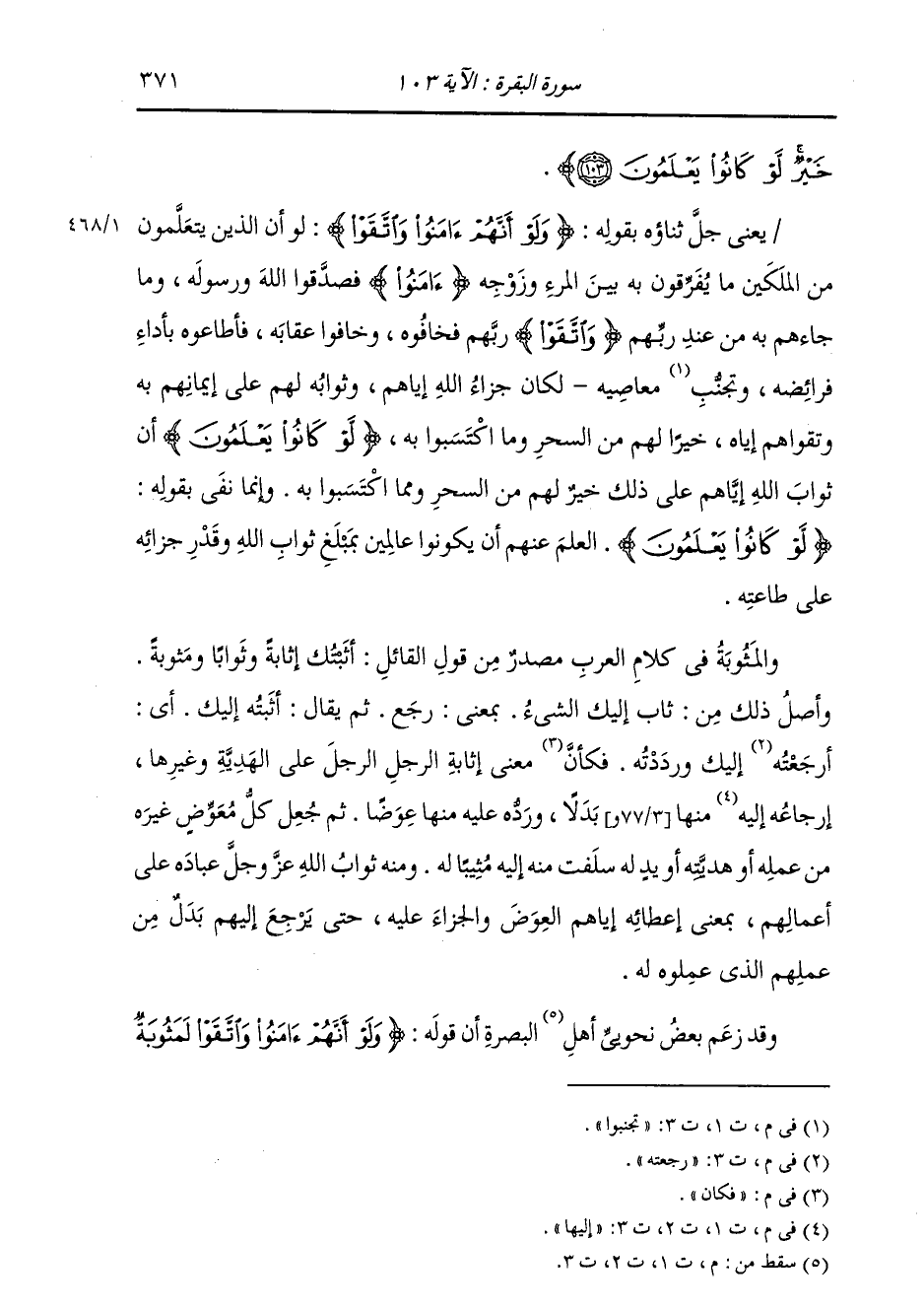 §يَعْنِي جَلَّ ثَنَاؤُهُ بِقَوْلِهِ: {وَلَوْ أَنَّهُمْ آمَنُوا وَاتَّقَوْا} [البقرة: 103] لَوْ أَنَّ الَّذِينَ يَتَعَلَّمُونَ مِنَ الْمَلَكَيْنِ مَا يُفَرِّقُونَ بِهِ بَيْنَ الْمَرْءِ وَزَوْجِهِ آمَنُوا، فَصَدَّقُوا اللَّهَ وَرَسُولَهُ وَمَا جَاءَهُمْ بِهِ مِنْ عِنْدِ رَبِّهِمْ، وَاتَّقَوْا رَبَّهُمْ فَخَافُوهُ فَخَافُوا عِقَابَهُ، فَأَطَاعُوهُ بِأَدَاءِ فَرَائِضِهِ وَتَجَنَّبُوا مَعَاصِيهِ؛ لَكَانَ جَزَاءُ اللَّهِ إِيَّاهُمْ وَثَوَابُهُ لَهُمْ عَلَى إِيمَانِهِمْ بِهِ وَتَقْوَاهُمْ إِيَّاهُ خَيْرًا لَهُمْ مِنَ السِّحْرِ وَمَا اكْتَسَبُوا بِهِ لَوْ كَانُوا يَعْلَمُونَ أَنَّ ثَوَابَ اللَّهِ إِيَّاهُمْ عَلَى ذَلِكَ خَيْرٌ لَهُمْ مِنَ السِّحْرِ وَمِمَّا اكْتَسَبُوا بِهِ. وَإِنَّمَا نَفَى بِقَوْلِهِ: {لَوْ كَانُوا يَعْلَمُونَ} [البقرة: 102] الْعِلْمَ عَنْهُمْ أَنْ يَكُونُوا عَالِمِينَ بِمَبْلَغِ ثَوَابِ اللَّهِ وَقَدْرِ جَزَائِهِ عَلَى طَاعَتِهِ. وَالْمَثُوبَةِ فِي كَلَامِ الْعَرَبِ مَصْدَرٌ مِنْ قَوْلِ الْقَائِلِ: أَثَبْتُكَ إِثَابَةً وَثَوَابًا وَمَثُوبَةً، فَأَصْلُ ذَلِكَ مِنْ ثَابَ إِلَيْكَ الشَّيْءُ بِمَعْنَى رَجَعَ، ثُمَّ يُقَالُ: أَثَبْتُهُ إِلَيْكَ: أَيْ رَجَعْتُهُ إِلَيْكَ وَرَدَدْتُهُ. فَكَانَ مَعْنَى إِثَابَةِ الرَّجُلِ الرَّجُلَ عَلَى الْهَدِيَّةِ وَغَيْرِهَا: إِرْجَاعُهُ إِلَيْهَا مِنْهَا بَدَلًا، وَرَدُّهُ عَلَيْهِ مِنْهَا عِوَضًا. ثُمَّ جُعِلَ كُلُّ مُعَوِّضٍ غَيْرَهُ مِنْ عَمَلِهِ أَوْ هَدِيَّتِهِ أَوْ يَدٍ لَهُ سَلَفَتْ مِنْهُ إِلَيْهِ مُثِيبًا لَهُ. وَمِنْهُ ثَوَابُ اللَّهِ عَزَّ وَجَلَّ عِبَادَهُ عَلَى أَعْمَالِهِمْ، بِمَعْنَى إِعْطَائِهِ إِيَّاهُمُ الْعِوَضَ وَالْجَزَاءَ عَلَيْهِ، حَتَّى يَرْجِعَ إِلَيْهِمْ بَدَلٌ مِنْ عَمَلِهِمْ الَّذِي عَمِلُوا لَهُ. وَقَدْ زَعَمَ بَعْضُ نَحْوِيِّي الْبَصْرَةِ أَنَّ قَوْلَهُ: {وَلَوْ أَنَّهُمْ آمَنُوا وَاتَّقَوْا لَمَثُوبَةٌ