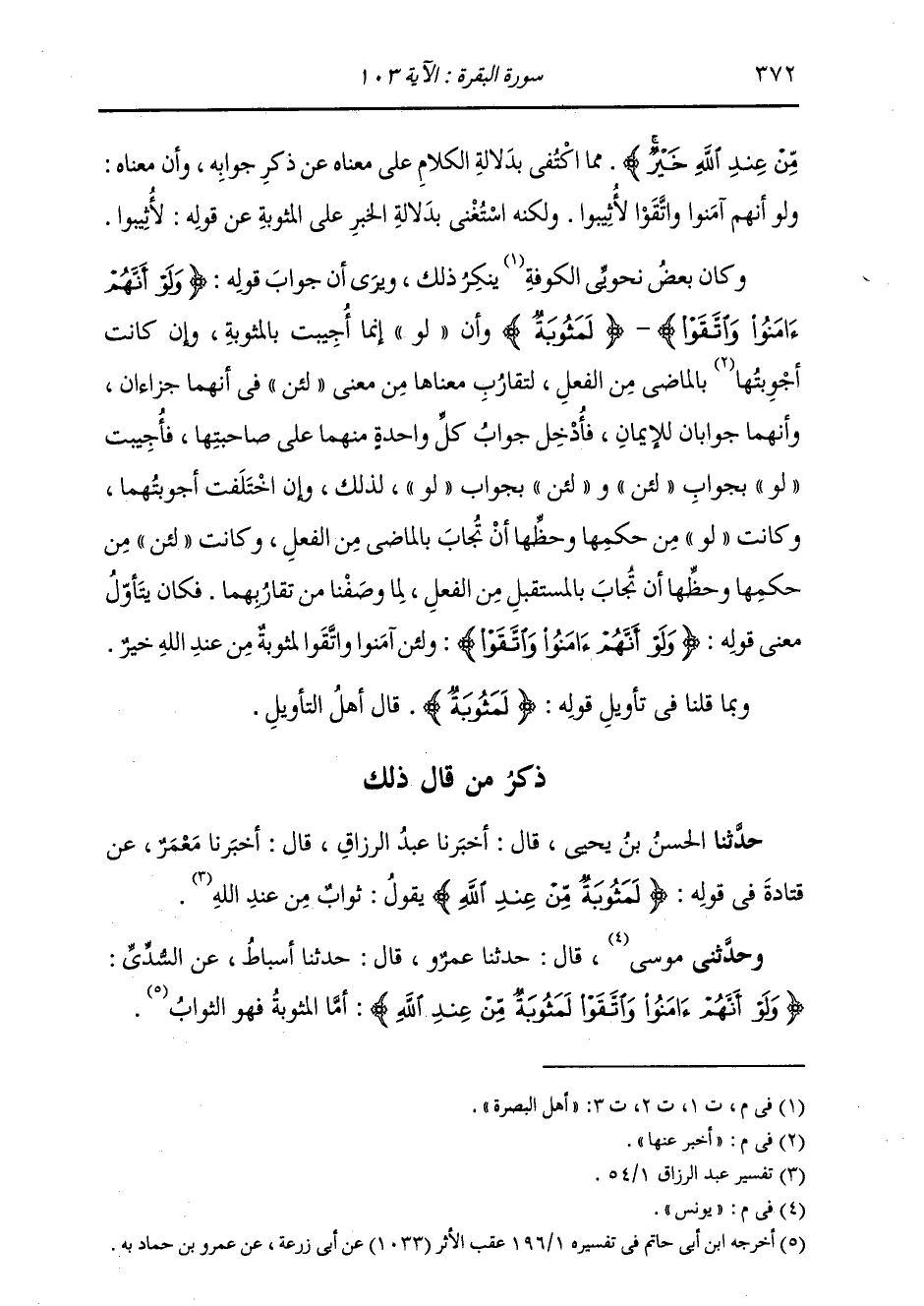 مِنْ عِنْدِ اللَّهِ خَيْرٌ} [البقرة: 103] مِمَّا اكْتَفَى بِدَلَالَةِ الْكَلَامِ عَلَى مَعْنَاهُ عَنْ ذِكْرِ جَوَابِهِ، وَأَنَّ مَعْنَاهُ: وَلَوْ أَنَّهُمْ آمَنُوا وَاتَّقَوْا لَأُثِيبُوا؛ وَلَكِنَّهُ اسْتَغْنَى بِدَلَالَةِ الْخَبَرِ عَنِ الْمَثُوبَةِ عَنْ قَوْلِهِ: لَأُثِيبُوا. وَكَانَ بَعْضُ نَحْوِيِّي أَهْلِ الْبَصْرَةِ يُنْكِرُ ذَلِكَ، وَيَرَى أَنَّ جَوَّابَ قَوْلِهِ: {وَلَوْ أَنَّهُمْ آمَنُوا وَاتَّقَوْا لَمَثُوبَةٌ} [البقرة: 103] وَأَنَّ «لَوْ» إِنَّمَا أُجِيبَتْ بِالْمَثُوبَةِ، وَإِنْ كَانَتْ أُخْبِرَ عَنْهَا بِالْمَاضِي مِنَ الْفِعْلِ لِتَقَارُبِ مَعْنَاهُ مِنْ مَعْنَى «لَئِنْ» فِي أَنَّهُمَا جَزَاءَانِ، فَإِنَّهُمَا جَوَابَانِ لِلْإِيمَانِ، فَأُدْخِلَ جَوَابُ كُلِّ وَاحِدَةٍ مِنْهُمَا عَلَى صَاحِبَتِهَا، فَأُجِيبَتْ لَوْ بِجَوَابِ لَئِنْ، وَلَئِنْ بِجَوَابِ لَوْ؛ لِذَلِكَ وَإِنِّ اخْتَلَفَتْ أَجْوِبَتُهُمَا فَكَانَتْ لَوْ مِنْ حُكْمِهَا وَحَظِّهَا أَنْ تُجَابَ بِالْمَاضِي مِنَ الْفِعْلِ، وَكَانَتْ لَئِنْ مِنْ حُكْمِهَا وَحَظِّهَا أَنْ تُجَابَ بِالْمُسْتَقْبَلِ مِنَ الْفِعْلِ لِمَا وَصَفْنَا مِنْ تَقَارُبِهِمَا، فَكَانَ يَتَأَوَّلُ مَعْنَى قَوْلِهِ: {وَلَوْ أَنَّهُمْ آمَنُوا وَاتَّقَوْا} [البقرة: 103] وَلَئِنْ آمَنُوا وَاتَّقَوْا لَمَثُوبَةٌ مِنْ عِنْدِ اللَّهِ خَيْرٌ. وَبِمَا قُلْنَا فِي تَأْوِيلِ الْمَثُوبَةِ قَالَ أَهْلُ التَّأْوِيلِ