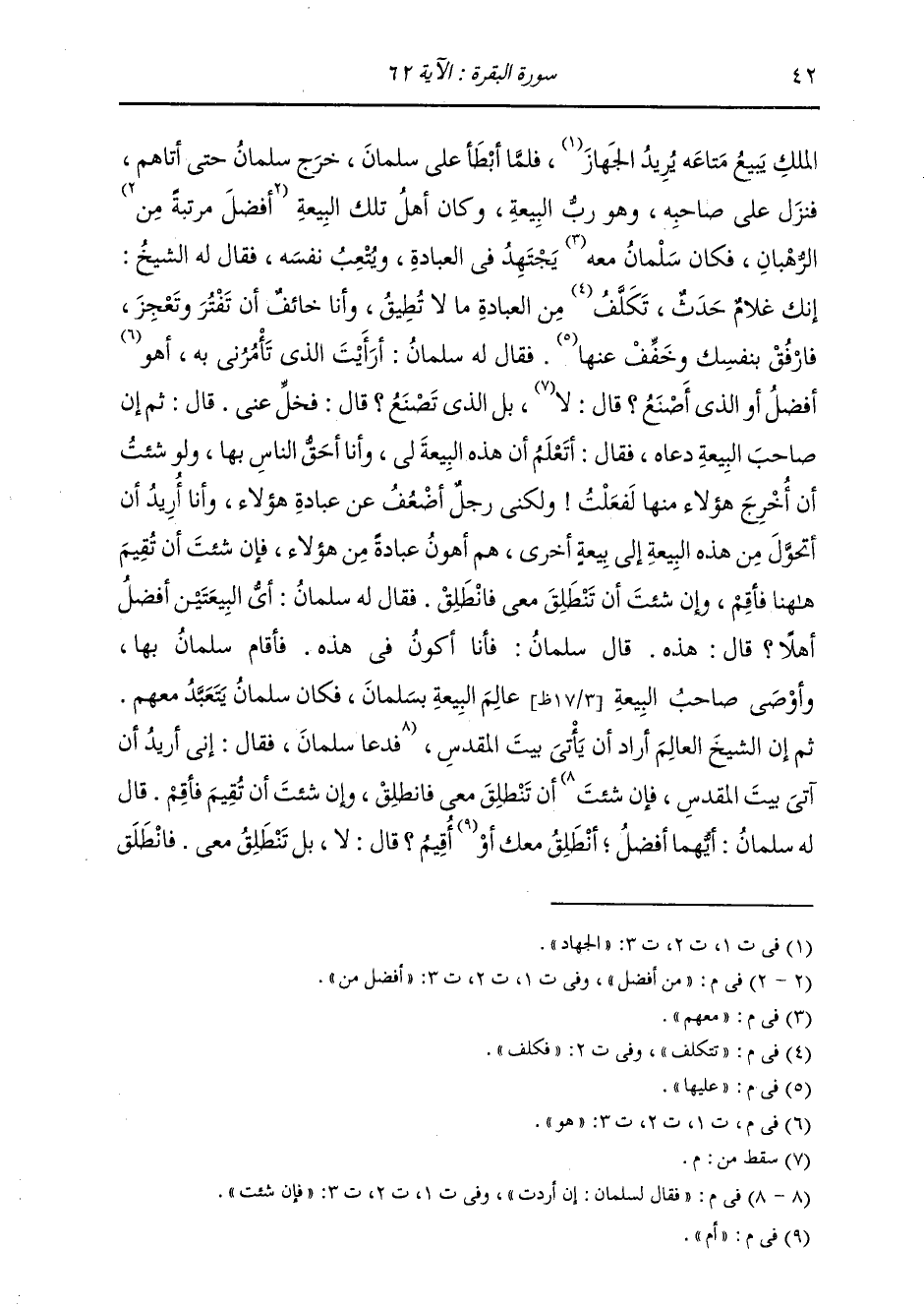الْمَلِكِ يَبِيعُ مَتَاعَهُ يُرِيدُ الْجِهَازَ. فَلَمَّا أَبْطَأَ عَلَى سَلْمَانَ، خَرَجَ سَلْمَانُ حَتَّى أَتَاهُمْ، فَنَزَلَ عَلَى صَاحِبِهِ وَهُوَ رَبُّ الْبَيْعَةِ، وَكَانَ أَهْلُ تِلْكَ الْبَيْعَةِ مِنْ أَفْضَلِ الرُّهْبَانِ، فَكَانَ سَلْمَانُ: مَعَهُمْ يَجْتَهِدُ فِي الْعِبَادَةِ، وَيُتْعِبُ نَفْسَهُ، فَقَالَ لَهُ الشَّيْخُ: إِنَّكَ غُلَامٌ حَدَثٌ تَتَكَلَّفُ مِنَ الْعِبَادَةِ مَا لَا تُطِيقُ، وَأَنَا خَائِفٌ أَنْ تَفْتُرَ وَتَعْجِزَ، فَارْفُقْ بِنَفْسِكَ وَخَفِّفْ عَلَيْهَا. فَقَالَ لَهُ سَلْمَانُ: أَرَأَيْتَ الَّذِيَ تَأْمُرُنِي بِهِ أَهُوَ أَفْضَلُ، أَوِ الَّذِي أَصْنَعُ؟ قَالَ: بَلِ الَّذِي تَصْنَعُ؟ قَالَ: فَخَلِّ عَنِّي. ثُمَّ إِنَّ صَاحِبَ الْبَيْعَةِ دَعَاهُ فَقَالَ: أَتَعْلَمُ أَنَّ هَذِهِ الْبَيْعَةَ لِي، وَأَنَا أَحَقُّ النَّاسِ بِهَا، وَلَوْ شِئْتُ أَنْ أُخْرِجَ هَؤُلَاءِ مِنْهَا لَفَعَلْتُ؟ وَلَكِنِّي رَجُلٌ أَضْعَفُ عَنْ عِبَادَةِ هَؤُلَاءِ، وَأَنَا أُرِيدُ أَنْ أَتَحَوَّلَ مِنْ هَذِهِ الْبَيْعَةِ إِلَى بَيْعَةٍ أُخْرَى هُمْ أَهْوَنُ عِبَادَةً مِنْ هَؤُلَاءِ، فَإِنْ شِئْتَ أَنْ تُقِيمَ هَهُنَا فَأَقِمْ، وَإِنْ شِئْتَ أَنْ تَنْطَلِقَ مَعِي فَانْطَلِقْ. قَالَ لَهُ سَلْمَانُ: أَيُّ الْبَيْعَتَيْنِ أَفْضَلُ أَهْلًا؟ قَالَ: هَذِهِ. قَالَ سَلْمَانُ: فَأَنَا أَكُونُ فِي هَذِهِ. فَأَقَامَ سَلْمَانُ بِهَا وَأَوْصَى صَاحِبَ الْبَيْعَةِ عَالِمَ الْبَيْعَةِ بِسَلْمَانَ، فَكَانَ سَلْمَانُ يَتَعَبَّدُ مَعَهُمْ. ثُمَّ إِنَّ الشَّيْخَ الْعَالِمَ أَرَادَ أَنْ يَأْتِيَ بَيْتَ الْمَقْدِسِ، فَقَالَ لِسَلْمَانَ: إِنْ أَرَدْتَ أَنْ تَنْطَلِقَ مَعِي فَانْطَلِقْ، وَإِنْ شِئْتَ أَنْ تُقِيمَ فَأَقِمْ. فَقَالَ لَهُ سَلْمَانُ: أَيُّهُمَا أَفْضَلُ أَنْطَلِقُ مَعَكَ أَمْ أُقِيمُ؟ قَالَ: لَا بَلْ تَنْطَلِقُ مَعِي. فَانْطَلَقَ