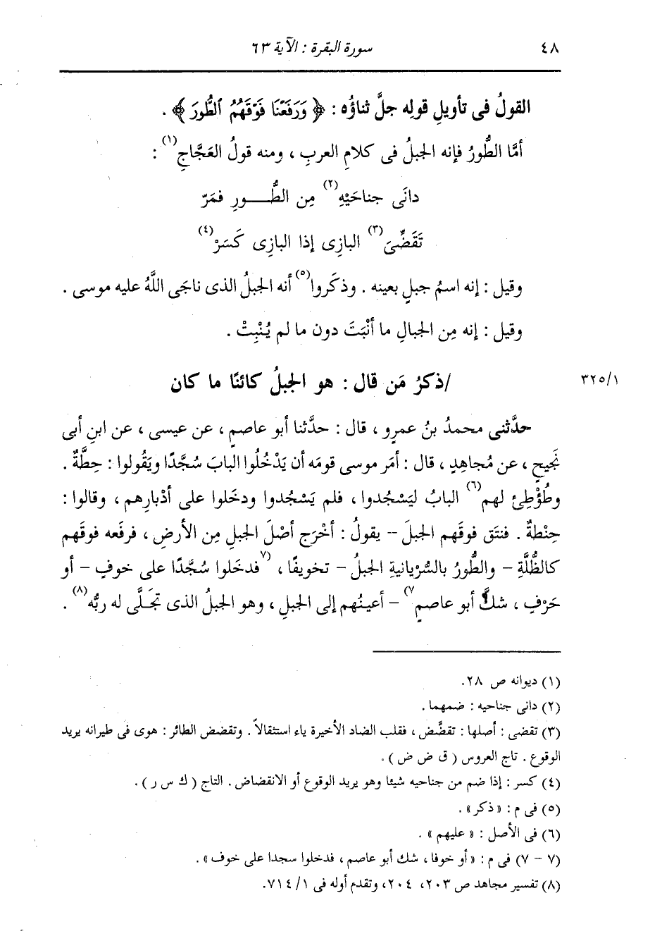 §الْقَوْلُ فِي تَأْوِيلِ قَوْلِهِ تَعَالَى: {وَرَفَعْنَا فَوْقَكُمُ الطُّورَ} [البقرة: 63] قَالَ أَبُو جَعْفَرٍ: وَأَمَّا الطُّورُ فَإِنَّهُ الْجَبَلُ فِي كَلَامِ الْعَرَبِ، وَمِنْهُ قَوْلُ الْعَجَّاجِ: