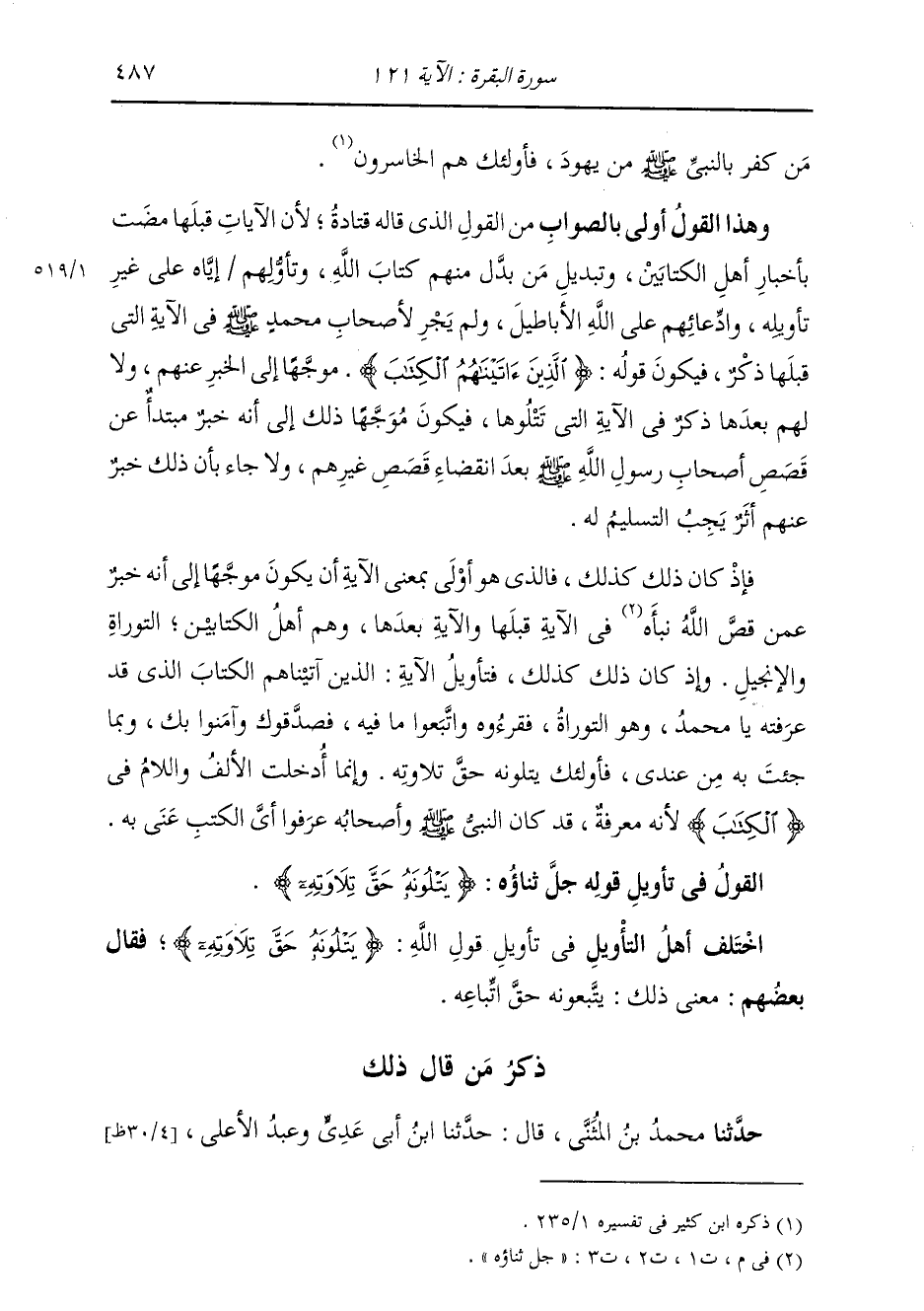 ذِكْرُ مَنْ قَالَ ذَلِكَ حَدَّثَنِي مُحَمَّدُ بْنُ الْمُثَنَّى، قَالَ: حَدَّثَنِي ابْنُ أَبِي عَدِيٍّ، وَعَبْدُ الْأَعْلَى، -[488]- وَحَدَّثَنَا عَمْرُو بْنُ عَلِيٍّ، قَالَ: ثَنَا ابْنُ أَبِي عَدِيٍّ، جَمِيعًا، عَنْ دَاوُدَ، عَنْ عِكْرِمَةَ، عَنِ ابْنِ عَبَّاسٍ: " {§يَتْلُونَهُ حَقَّ تِلَاوَتِهِ} [البقرة: 121] يَتَّبِعُونَهُ حَقَّ اتِّبَاعِهِ " حَدَّثَنِي الْمُثَنَّى قَالَ: ثَنَا عَبْدُ الْوَهَّابِ قَالَ: ثَنَا دَاوُدُ، عَنْ عِكْرِمَةَ بِمِثْلِهِ وَحَدَّثَنَا عَمْرُو بْنُ عَلِيٍّ قَالَ: ثَنَا يَزِيدُ بْنُ زُرَيْعٍ قَالَ: ثَنَا دَاوُدُ بْنُ أَبِي هِنْدَ، عَنْ عِكْرِمَةَ بِمِثْلِهِ