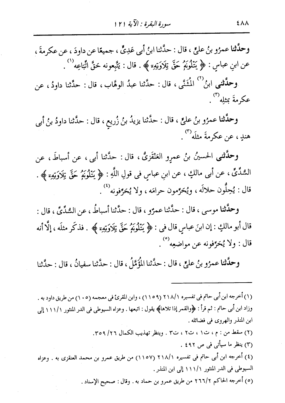 حَدَّثَنِي الْحَسَنُ بْنُ عَمْرٍو الْعَنْقَزِيُّ، قَالَ: حَدَّثَنِي أَبِي، عَنْ أَسْبَاطٍ، عَنِ السُّدِّيِّ، عَنْ أَبِي مَالِكٍ، عَنِ ابْنِ عَبَّاسٍ: " فِي قَوْلِ اللَّهِ عَزَّ وَجَلَّ: {§يَتْلُونَهُ حَقَّ تِلَاوَتِهِ} [البقرة: 121] قَالَ: يُحِلُّونَ حَلَالَهُ وَيُحَرِّمُونَ حَرَامَهُ وَلَا يُحَرِّفُونَ " حَدَّثَنِي مُوسَى قَالَ: ثَنَا عَمْرٌو قَالَ: ثَنَا أَسْبَاطٌ، عَنِ السُّدِّيِّ قَالَ: قَالَ أَبُو مَالِكٍ: أَنَّ ابْنَ عَبَّاسٍ قَالَ فِي: " {يَتْلُونَهُ حَقَّ تِلَاوَتِهِ} [البقرة: 121] فَذَكَرَ مِثْلَهُ؛ إِلَّا أَنَّهُ قَالَ: وَلَا يُحَرِّفُونَهُ عَنْ مَوَاضِعِهِ