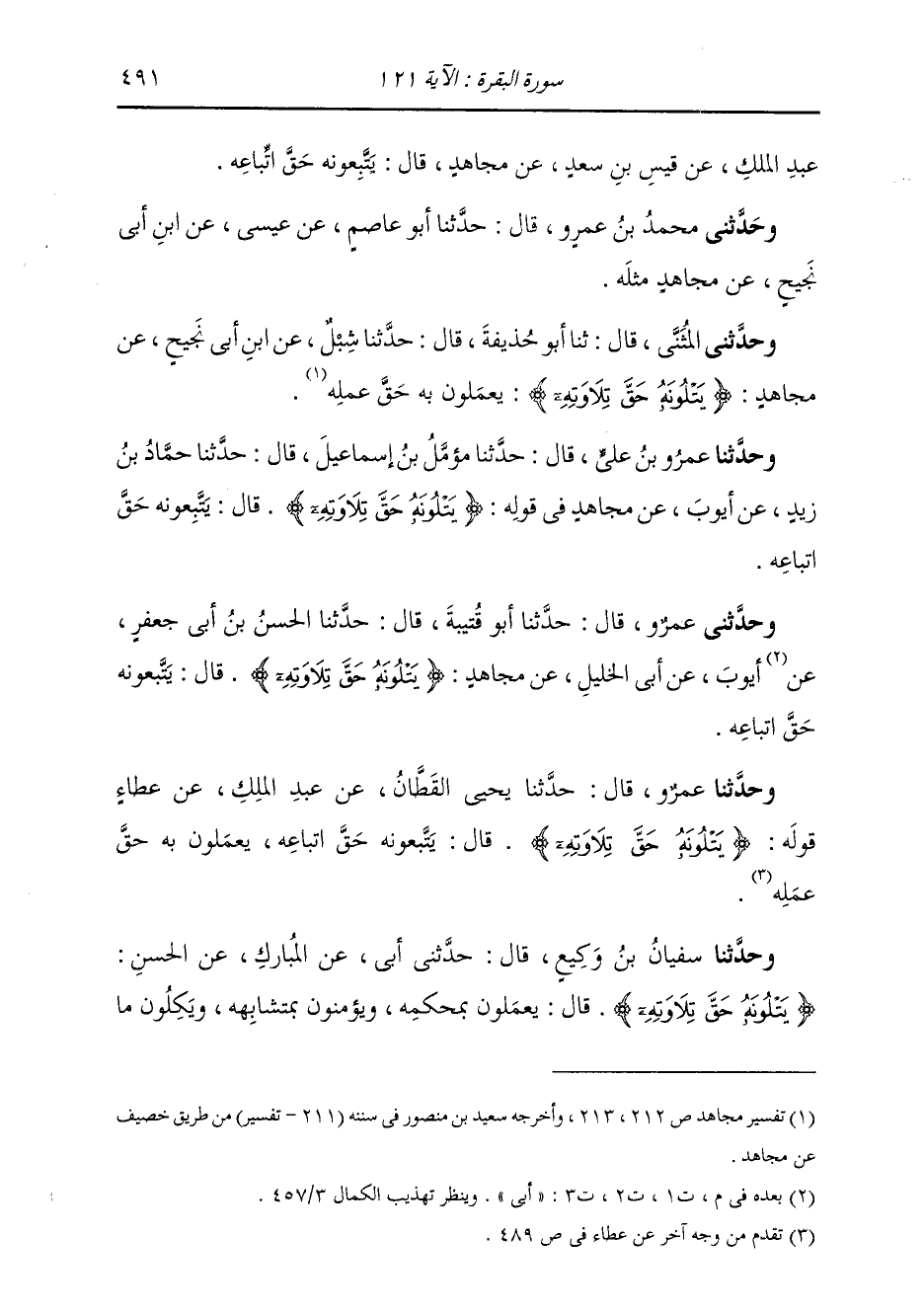 حَدَّثَنَا عَمْرُو بْنُ عَلِيٍّ قَالَ: ثَنَا مُؤَمَّلُ بْنُ إِسْمَاعِيلَ قَالَ: ثَنَا حَمَّادُ بْنُ زَيْدٍ، عَنْ أَيُّوبَ، عَنْ مُجَاهِدٍ: " فِي قَوْلِهِ: {§يَتْلُونَهُ حَقَّ تِلَاوَتِهِ} [البقرة: 121] قَالَ: يَتَّبِعُونَهُ حَقَّ اتِّبَاعِهِ "