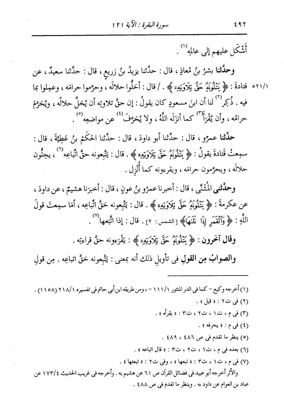 حَدَّثَنَا الْمُثَنَّى، قَالَ: ثَنَا عَمْرُو بْنُ عَوْنٍ، قَالَ: أَخْبَرَنَا هُشَيْمٌ، عَنْ دَاوُدَ، عَنْ عِكْرِمَةَ: " فِي قَوْلِهِ: {§يَتْلُونَهُ حَقَّ تِلَاوَتِهِ} [البقرة: 121] قَالَ: يَتَّبِعُونَهُ حَقَّ اتِّبَاعِهِ، أَمَا سَمِعْتَ قَوْلَ اللَّهِ عَزَّ وَجَلَّ: {وَالْقَمَرِ إِذَا تَلَاهَا} [الشمس: 2] ؟ قَالَ: إِذَا تَبِعَهَا " وَقَالَ آخَرُونَ {يَتْلُونَهُ حَقَّ تِلَاوَتِهِ} [البقرة: 121] يَقْرَءُونَهُ حَقَّ قِرَاءَتِهِ. وَالصَّوَابُ مِنَ الْقَوْلِ فِي تَأْوِيلِ ذَلِكَ أَنَّهُ بِمَعْنَى: يَتَّبِعُونَهُ حَقَّ اتِّبَاعِهِ، مِنْ قَوْلِ -[493]- الْقَائِلِ: مَا زِلْتُ أَتْلُو أَثَرَهُ، إِذَا اتُّبِعَ أَثَرُهُ؛ لِإِجْمَاعِ الْحُجَّةِ مِنْ أَهْلِ التَّأْوِيلِ عَلَى أَنَّ ذَلِكَ تَأْوِيلُهُ. وَإِذَا كَانَ ذَلِكَ تَأْوِيلَهُ، فَمَعْنَى الْكَلَامِ: الَّذِينَ آتَيْنَاهُمُ الْكِتَابَ يَا مُحَمَّدُ مِنْ أَهْلِ التَّوْرَاةِ الَّذِينَ آمَنُوا بِكَ وَبِمَا جِئْتَهُمْ بِهِ مِنَ الْحَقِّ مِنْ عِنْدِي، يَتَّبِعُونَ كِتَابِي الَّذِي أَنْزَلْتُهُ عَلَى رَسُولِي مُوسَى صَلَوَاتُ اللَّهُ عَلَيْهِ، فَيُؤْمِنُونَ بِهِ، وَيُقِرُّونَ بِمَا فِيهِ مِنْ نَعْتِكَ وَصِفَتِكَ، وَأَنَّكَ رَسُولِي فُرِضَ عَلَيْهِمْ طَاعَتِي فِي الْإِيمَانِ بِكَ وَالتَّصْدِيقِ بِمَا جِئْتَهُمْ بِهِ مِنْ عِنْدِي، وَيَعْمَلُونَ بِمَا أَحْلَلْتَ لَهُمْ، وَيَجْتَنِبُونَ مَا حَرَّمْتَ عَلَيْهِمْ فِيهِ، وَلَا يُحَرِّفُونَهُ عَنْ مَوَاضِعِهِ وَلَا يُبَدِّلُونَهُ وَلَا يُغَيِّرُونَهُ كَمَا أَنْزَلْتُهُ عَلَيْهِمْ بِتَأْوِيلٍ وَلَا غَيْرِهِ. أَمَّا قَوْلُهُ: {حَقَّ تِلَاوَتِهِ} [البقرة: 121] فَمُبَالَغَةٌ فِي صِفَةِ اتِّبَاعِهِمُ الْكِتَابَ وَلُزُومِهِمُ الْعَمَلَ بِهِ، كَمَا يُقَالُ: إِنَّ فُلَانًا لَعَالِمٌ حَقَّ عَالِمٍ، وَكَمَا يُقَالُ: إِنَّ فُلَانًا لَفَاضِلٌ كُلَّ فَاضِلٍ. وَقَدِ اخْتَلَفَ أَهْلُ الْعَرَبِيَّةِ فِي إِضَافَةِ «حَقَّ» إِلَى الْمَعْرِفَةِ، فَقَالَ بَعْضُ نَحْوِيِّي الْكُوفَةِ: غَيْرُ جَائِزَةٍ إِضَافَتُهُ إِلَى مَعْرِفَةٍ لِأَنَّهُ بِمَعْنَى «أَيْ» ، وَبِمَعْنَى قَوْلِكَ: أَفْضَلُ رَجُلٍ فُلَانٌ، وَأَفْعَلُ لَا يُضَافُ إِلَى وَاحِدٍ مَعْرِفَةٍ لِأَنَّهُ مُبَعَّضٌ، وَلَا يَكُونُ الْوَاحِدُ الْمُبَعَّضُ مَعْرِفَةً. فَأَحَالُوا أَنْ يُقَالَ: مَرَرْتُ بِالرَّجُلِ حَقَّ الرَّجُلِ، وَمَرَرْتُ بِالرَّجُلِ جَدَّ الرَّجُلِ، كَمَا أَحَالُوا مَرَرْتُ بِالرَّجُلِ أَيِ الرَّجُلِ، وَأَجَازُوا ذَلِكَ فِي كُلِّ الرَّجُلِ وَعَيْنِ الرَّجُلِ وَنَفْسِ الرَّجُلِ، وَقَالُوا: إِنَّمَا أَجَزْنَا ذَلِكَ لِأَنَّ هَذِهِ -[494]- الْحُرُوفَ كَانَتْ فِي الْأَصْلِ تَوْكِيدًا، فَلَمَّا صِرْنَ مُدُوحًا تُرِكْنَ مُدُوحًا عَلَى أُصُولِهِنَّ فِي الْمَعْرِفَةِ. وَزَعَمُوا أَنَّ قَوْلَهُ: {يَتْلُونَهُ حَقَّ تِلَاوَتِهِ} [البقرة: 121] إِنَّمَا جَازَتْ إِضَافَتُهُ إِلَى التِّلَاوَةِ، وَهِيَ مُضَافَةٌ إِلَى مَعْرِفَةٍ؛ لِأَنَّ الْعَرَبَ تَعْتَدُّ بِالْهَاءِ إِذَا عَادَتْ إِلَى نَكِرَةٍ بِالنَّكِرَةِ، فَيَقُولُونَ: مَرَرْتُ بِرَجُلٍ وَاحِدٍ أُمِّهِ، وَنَسِيجٌ وَحْدَهُ، وَسَيِّدُ قَوْمِهِ. قَالُوا: فَكَذَلِكَ قَوْلُهُ: {حَقَّ تِلَاوَتِهِ} [البقرة: 121] إِنَّمَا جَازَتْ إِضَافَةُ «حَقَّ» إِلَى التِّلَاوَةِ وَهِيَ مُضَافَةٌ إِلَى «الْهَاءِ» ، لِاعْتِدَادِ الْعَرَبِ بِ «الْهَاءِ» الَّتِي فِي نَظَائِرِهَا فِي عِدَادِ النَّكِرَاتِ. قَالُوا: وَلَوْ كَانَ ذَلِكَ حَقَّ التِّلَاوَةَ لَوَجَبَ أَنْ يَكُونَ جَائِزًا: مَرَرْتُ بِالرَّجُلِ حَقَّ الرَّجُلِ، فَعَلَى هَذَا الْقَوْلِ تَأْوِيلُ الْكَلَامِ: الَّذِينَ آتَيْنَاهُمُ الْكِتَابَ يَتْلُونَهُ حَقَّ تِلَاوَة