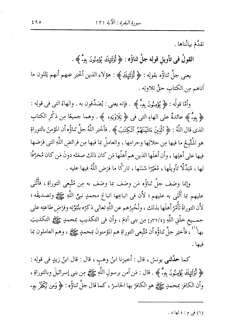 §الْقَوْلُ فِي تَأْوِيلِ قَوْلِهِ تَعَالَى: {أُولَئِكَ يُؤْمِنُونَ بِهِ} [البقرة: 121] قَالَ أَبُو جَعْفَرٍ: يَعْنِي جَلَّ ثَنَاؤُهُ بِقَوْلِهِ: {أُولَئِكَ} [البقرة: 5] هَؤُلَاءِ الَّذِينَ أَخْبَرَ عَنْهُمْ أَنَّهُمْ يَتْلُونَ مَا آتَاهُمْ مِنَ الْكِتَابِ حَقَّ تِلَاوَتِهِ. وَأَمَّا قَوْلُهُ: {يُؤْمِنُونَ بِهِ} [البقرة: 121] فَإِنَّهُ يَعْنِي يُصَدِّقُونَ بِهِ. وَالْهَاءُ الَّتِي فِي قَوْلِهِ: «بِهِ» عَائِدَةٌ عَلَى الْهَاءِ الَّتِي فِي «تِلَاوَتِهِ» ، وَهُمَا جَمِيعًا مِنْ ذِكْرِ الْكِتَابِ الَّذِي قَالَهُ اللَّهُ: {الَّذِينَ آتَيْنَاهُمُ الْكِتَابَ} [البقرة: 121] فَأَخْبَرَ اللَّهُ جَلَّ ثَنَاؤُهُ أَنَّ الْمُؤْمِنَ بِالتَّوْرَاةِ هُوَ الْمُتَّبِعُ مَا فِيهَا مِنْ حَلَالِهَا وَحَرَامِهَا، وَالْعَامِلُ بِمَا فِيهَا مِنْ فَرَائِضِ اللَّهِ الَّتِي فَرَضَهَا فِيهَا عَلَى أَهْلِهَا، وَأَنَّ أَهْلَهَا الَّذِينَ هُمْ أَهْلُهَا مَنْ كَانَ ذَلِكَ صِفَتُهُ دُونَ مَنْ كَانَ مُحَرِّفًا لَهَا مُبَدِّلًا تَأْوِيلَهَا مُغَيِّرًا سُنَنَهَا تَارِكًا مَا فَرَضَ اللَّهُ فِيهَا عَلَيْهِ. وَإِنَّمَا وَصَفَ جَلَّ ثَنَاؤُهُ مَنْ وَصَفَ بِمَا وَصَفَ بِهِ مِنْ مُتَّبِعِي التَّوْرَاةِ، وَأَثْنَى عَلَيْهِمْ بِمَا أَثْنَى بِهِ عَلَيْهِمْ؛ لِأَنَّ فِي اتِّبَاعِهَا اتِّبَاعُ مُحَمَّدٍ نَبِيِّ اللَّهِ صَلَّى اللهُ عَلَيْهِ وَسَلَّمَ وَتَصْدِيقِهِ، لِأَنَّ التَّوْرَاةَ تَأْمُرُ أَهْلَهَا بِذَلِكَ وَتُخْبِرُهُمْ عَنِ اللَّهِ تَعَالَى ذِكْرُهُ بِنُبُوَّتِهِ وَفَرْضِ طَاعَتِهِ عَلَى جَمِيعِ خَلْقِ اللَّهِ مِنْ بَنِي آدَمَ، وَإِنَّ فِي التَّكْذِيبِ بِمُحَمَّدٍ التَّكْذِيبَ لَهَا. فَأَخْبَرَ جَلَّ ثَنَاؤُهُ أَنَّ مُتَّبِعِي التَّوْرَاةَ هُمُ الْمُؤْمِنُونَ بِمُحَمَّدٍ صَلَّى اللهُ عَلَيْهِ وَسَلَّمَ، وَهُمُ الْعَامِلُونَ بِمَا فِيهَا