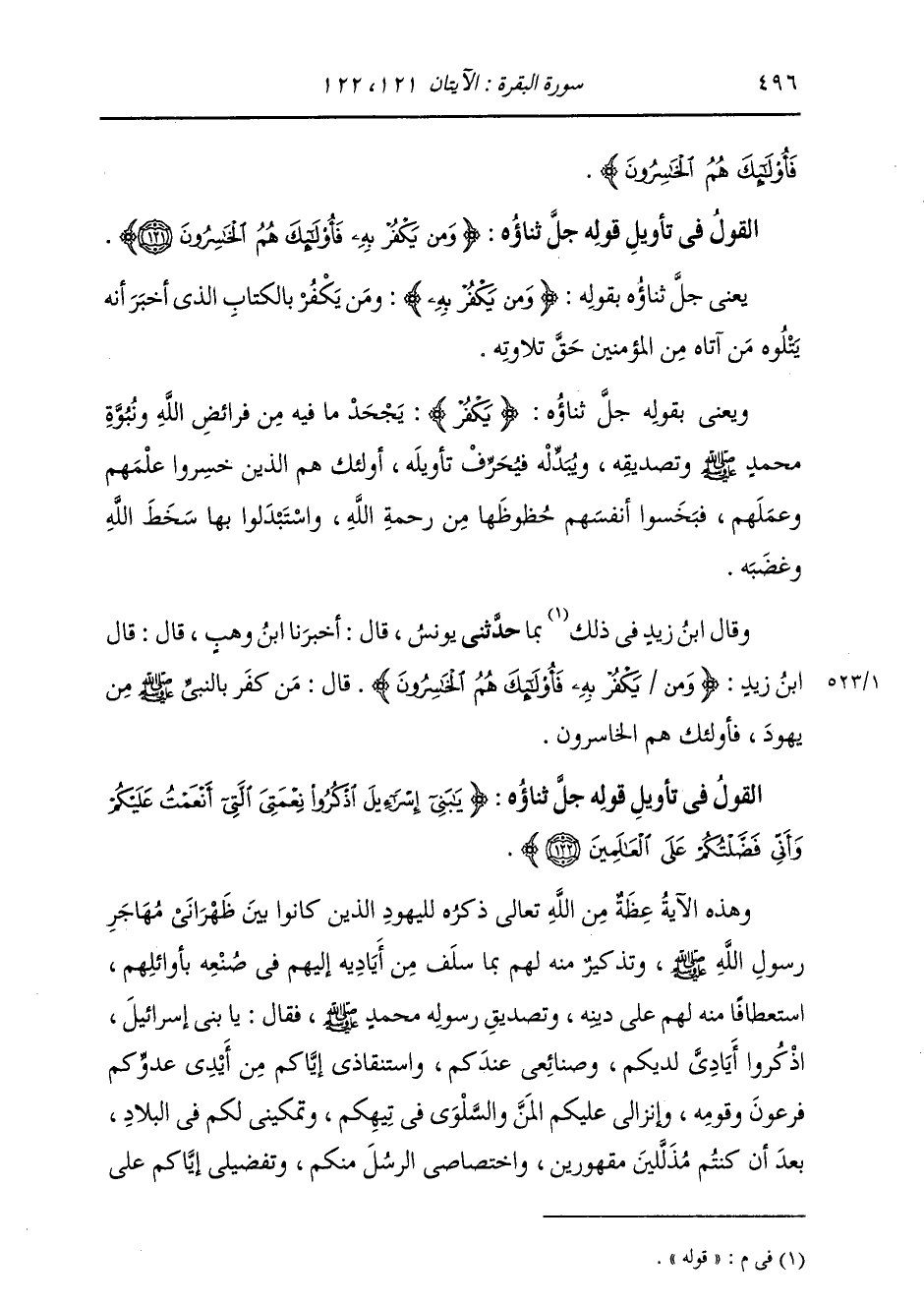 §الْقَوْلُ فِي تَأْوِيلِ قَوْلِهِ تَعَالَى: {وَمَنْ يَكْفُرْ بِهِ فَأُولَئِكَ هُمُ الْخَاسِرُونَ} [البقرة: 121] يَعْنِي جَلَّ ثَنَاؤُهُ بِقَوْلِهِ: {وَمَنْ يَكْفُرْ بِهِ} [البقرة: 121] وَمَنْ يَكْفُرْ بِالْكِتَابِ الَّذِي أَخْبَرَ أَنَّهُ يَتْلُوهُ مَنْ آتَاهُ مِنَ الْمُؤْمِنِينَ حَقَّ تِلَاوَتِهِ. وَيَعْنِي بِقَوْلِهِ جَلَّ ثَنَاؤُهُ: {يَكْفُرْ} [البقرة: 99] يَجْحَدُ مَا فِيهِ مِنْ فَرَائِضِ اللَّهِ وَنُبُوَّةِ مُحَمَّدٍ صَلَّى اللهُ عَلَيْهِ وَسَلَّمَ، وَتَصْدِيقِهِ، وَيُبَدِّلُهُ، فَيُحَرِّفُ تَأْوِيلَهُ؛ أُولَئِكَ هُمُ الَّذِينَ خَسِرُوا عِلْمَهُمْ وَعَمَلَهُمْ فَبَخَسُوا أَنْفُسَهُمْ حُظُوظَهَا مِنْ رَحْمَةِ اللَّهِ وَاسْتَبْدَلُوا بِهَا سَخَطَ اللَّهِ وَغَضَبَهُ