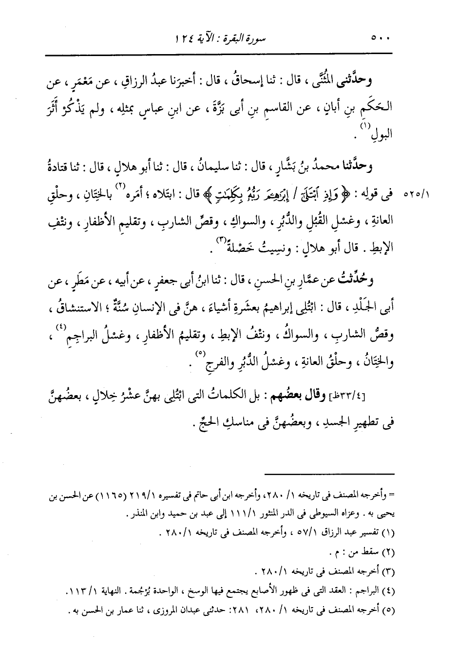 حَدَّثَنَا مُحَمَّدُ بْنُ بَشَّارٍ، قَالَ: ثَنَا سُلَيْمَانُ، قَالَ: ثَنَا أَبُو هِلَالٍ، قَالَ: ثَنَا قَتَادَةُ: " فِي قَوْلِهِ: {§وَإِذِ ابْتَلَى إِبْرَاهِيمَ رَبُّهُ بِكَلِمَاتٍ} [البقرة: 124] قَالَ: ابْتَلَاهُ بِالْخِتَانِ، وَحَلْقِ الْعَانَةِ، وَغَسْلِ الْقُبُلِ وَالدُّبُرِ، وَالسِّوَاكِ، وَقَصِّ الشَّارِبِ، وَتَقْلِيمِ الْأَظَافِرِ، وَنَتْفِ الْإِبِطِ. قَالَ أَبُو هِلَالٍ: وَنَسِيتُ خِصْلَةً "