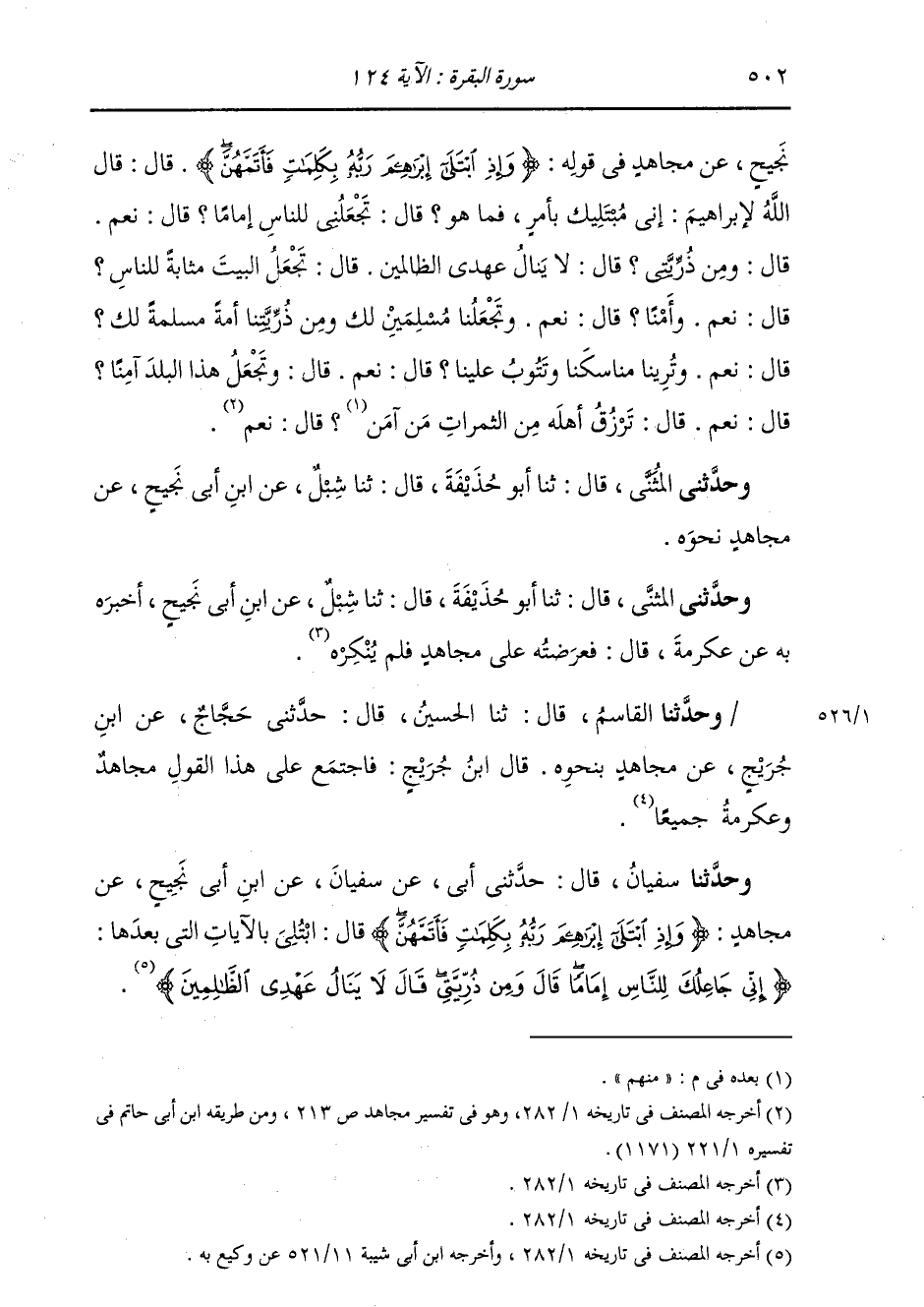 حَدَّثَنَا سُفْيَانُ، قَالَ: حَدَّثَنِي أَبِي، عَنْ سُفْيَانَ، عَنِ ابْنِ أَبِي نَجِيحٍ، عَنْ مُجَاهِدٍ: " {§وَإِذِ ابْتَلَى إِبْرَاهِيمَ رَبُّهُ بِكَلِمَاتٍ فَأَتَمَّهُنَّ} [البقرة: 124] قَالَ: ابْتُلِيَ بِالْآيَاتِ الَّتِي بَعْدَهَا: {إِنِّي جَاعِلُكَ لِلنَّاسِ إِمَامًا قَالَ وَمِنْ ذُرِّيَّتِي قَالَ لَا يَنَالُ عَهْدِي الظَّالِمِينَ} [البقرة: 124] "