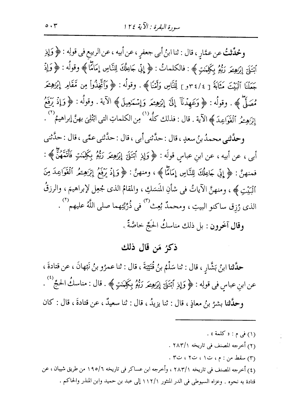 حَدَّثَنَا بِشْرُ بْنُ مُعَاذٍ قَالَ: ثَنَا يَزِيدُ بْنُ زُرَيْعٍ قَالَ: ثَنَا سَعِيدٌ، عَنْ قَتَادَةَ قَالَ: كَانَ -[504]- ابْنُ عَبَّاسٍ يَقُولُ فِي قَوْلِهِ: " {§وَإِذِ ابْتَلَى إِبْرَاهِيمَ رَبُّهُ بِكَلِمَاتٍ} [البقرة: 124] قَالَ: الْمَنَاسِكُ "