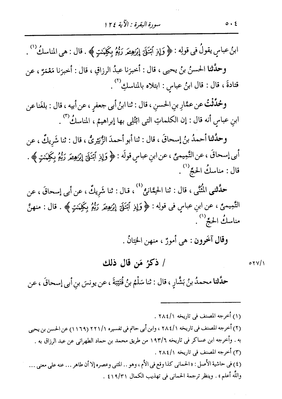 حَدَّثَنِي الْمُثَنَّى قَالَ: ثَنَا الْحِمَّانِيُّ قَالَ: ثَنَا شَرِيكٌ، عَنْ أَبِي إِسْحَاقَ، عَنِ التَّمِيمِيِّ، عَنِ ابْنِ عَبَّاسٍ: " فِي قَوْلِهِ: {§وَإِذِ ابْتَلَى إِبْرَاهِيمَ رَبُّهُ بِكَلِمَاتٍ} [البقرة: 124] قَالَ: مِنْهُنَّ مَنَاسِكُ الْحَجِّ " وَقَالَ آخَرُونَ: هِيَ أُمُورٌ مِنْهُنَّ الْخِتَانُ