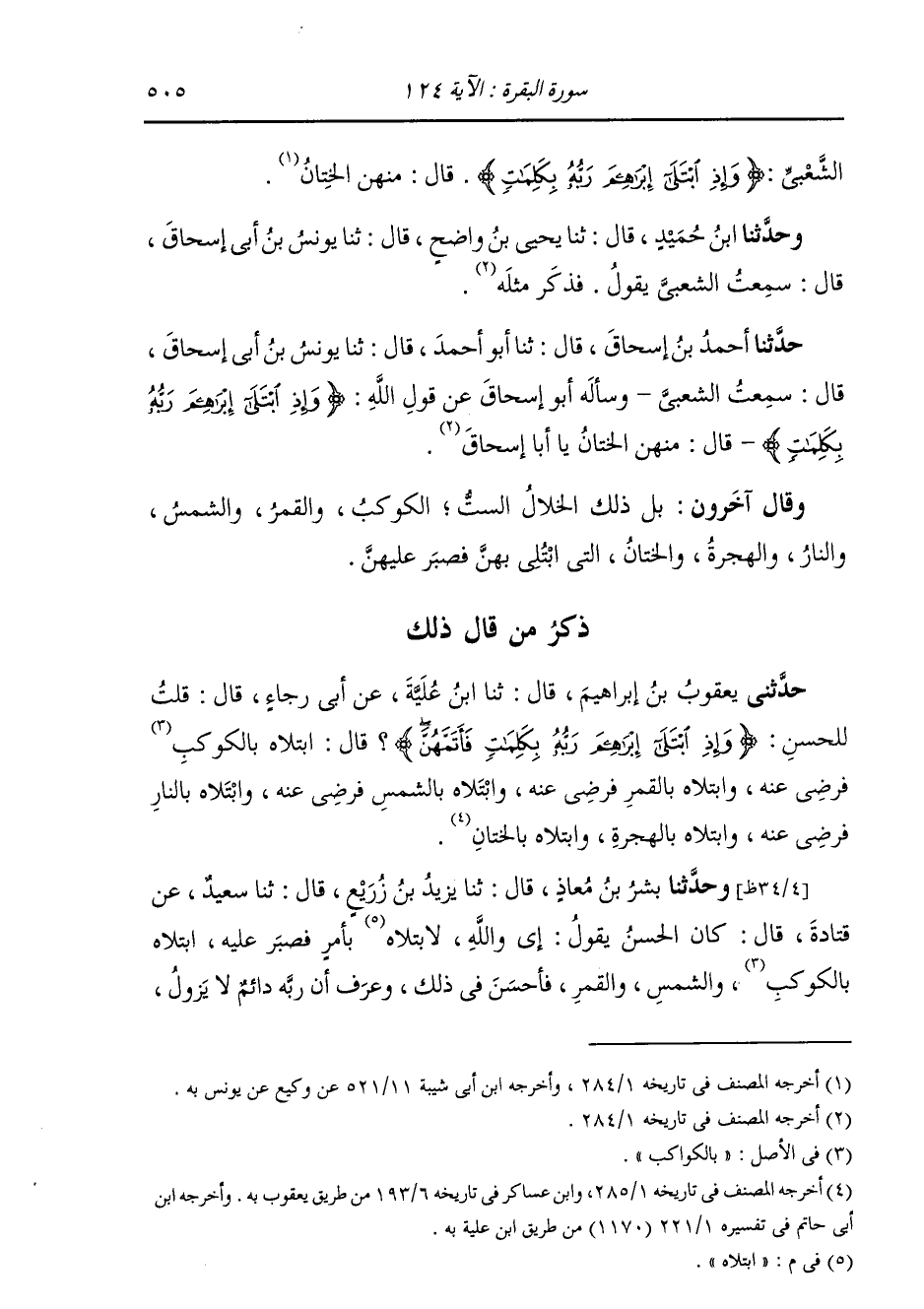 حَدَّثَنَا أَحْمَدُ بْنُ إِسْحَاقَ، قَالَ: ثَنَا أَبُو أَحْمَدَ، قَالَ: ثَنَا يُونُسُ بْنُ أَبِي إِسْحَاقَ، قَالَ: سَمِعْتُ الشَّعْبِيَّ، وَسَأَلَهُ أَبُو إِسْحَاقَ عَنْ قَوْلِ اللَّهِ: {§وَإِذِ ابْتَلَى إِبْرَاهِيمَ رَبُّهُ بِكَلِمَاتٍ} [البقرة: 124] قَالَ: مِنْهُنَّ الْخِتَانُ يَا أَبَا إِسْحَاقَ " وَقَالَ آخَرُونَ: بَلْ ذَلِكَ الْخِلَالُ السِّتُّ: الْكَوْكَبُ، وَالْقَمَرُ، وَالشَّمْسُ، وَالنَّارُ، وَالْهِجْرَةُ، وَالْخِتَانُ، الَّتِي ابْتُلِيَ بِهِنَّ فَصَبَرَ عَلَيْهِنَّ