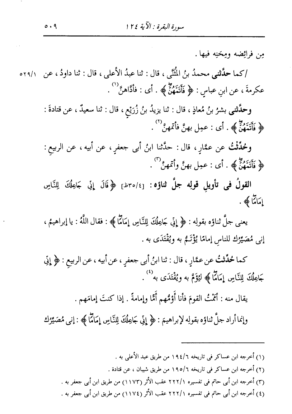 §الْقَوْلُ فِي تَأْوِيلِ قَوْلِهِ تَعَالَى: {قَالَ إِنِّي جَاعِلُكَ لِلنَّاسِ إِمَامًا} [البقرة: 124] يَعْنِي جَلَّ ثَنَاؤُهُ بِقَوْلِهِ: {إِنِّي جَاعِلُكَ لِلنَّاسِ إِمَامًا} [البقرة: 124] فَقَالَ اللَّهُ: يَا إِبْرَاهِيمُ إِنِّي مُصَيِّرُكَ لِلنَّاسِ إِمَامًا يُؤْتَمُّ بِهِ وَيُقْتَدَى بِهِ