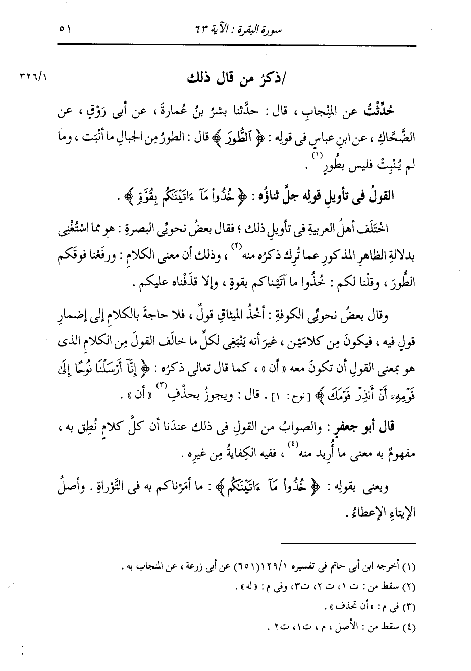 §الْقَوْلُ فِي تَأْوِيلِ قَوْلِهِ تَعَالَى: {خُذُوا مَا آتَيْنَاكُمْ بِقُوَّةٍ} [البقرة: 63] قَالَ أَبُو جَعْفَرٍ: اخْتَلَفَ أَهْلُ الْعَرَبِيَّةِ فِي تَأْوِيلِ ذَلِكَ، فَقَالَ بَعْضُ نَحْوِيِّي أَهْلِ الْبَصْرَةِ: هُوَ مِمَّا اسْتُغْنِيَ بِدَلَالَةِ الظَّاهِرِ الْمَذْكُورِ عَمَّا تُرِكَ ذِكْرُهُ لَهُ، وَذَلِكَ أَنَّ مَعْنَى الْكَلَامِ: وَرَفَعْنَا فَوْقَكُمُ الطُّورَ وَقُلْنَا لَكُمْ خُذُوا مَا آتَيْنَاكُمْ بِقُوَّةٍ، وَإِلَّا قَذَفْنَاهُ عَلَيْكُمْ. وَقَالَ بَعْضُ نَحْوِيِّي أَهْلِ الْكُوفَةِ: أَخْذُ الْمِيثَاقِ قَوْلٌ فَلَا حَاجَةَ بِالْكَلَامِ إِلَى إِضْمَارِ قَوْلٍ فِيهِ، فَيَكُونُ مِنْ كَلَامَيْنِ غَيْرَ أَنَّهُ يَنْبَغِي لِكُلِّ مَا خَالَفَ الْقَوْلَ مِنَ الْكَلَامِ الَّذِي هُوَ بِمَعْنَى الْقَوْلِ أَنْ يَكُونَ مَعَهُ أَنْ كَمَا قَالَ اللَّهُ جَلَّ ثَنَاؤُهُ: {إِنَّا أَرْسَلْنَا نُوحًا إِلَى قَوْمِهِ أَنْ أَنْذِرْ قَوْمَكَ} [نوح: 1] قَالَ: وَيَجُوزُ أَنْ تَحْذِفَ أَنْ. وَالصَّوَابُ فِي ذَلِكَ عِنْدَنَا أَنَّ كُلَّ كَلَامٍ نُطِقَ بِهِ مَفْهُومٌ بِهِ مَعْنَى مَا أُرِيدَ فَفِيهِ الْكِفَايَةُ مِنْ غَيْرِهِ، وَيَعْنِي بِقَوْلِهِ {خُذُوا مَا آتَيْنَاكُمْ} [البقرة: 63] مَا أَمَرْنَاكُمْ بِهِ فِي التَّوْرَاةِ، وَأَصْلُ الْإِيتَاءِ: الْإِعْطَاءُ.