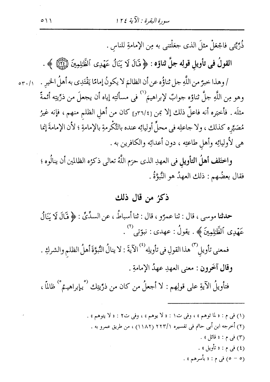 ذِكْرُ مَنْ قَالَ ذَلِكَ حَدَّثَنِي مُوسَى، قَالَ: ثَنَا عَمْرٌو، قَالَ: ثَنَا أَسْبَاطٌ، عَنِ السُّدِّيِّ، قَالَ: " {§لَا يَنَالُ عَهْدِي الظَّالِمِينَ} [البقرة: 124] يَقُولُ: عَهْدِي: نُبُوَّتِي " فَمَعْنَى قَائِلِ هَذَا الْقَوْلِ فِي تَأْوِيلِ الْآيَةِ: لَا يَنَالُ النُّبُوَّةَ أَهْلُ الظُّلْمِ وَالشِّرْكِ وَقَالَ آخَرُونَ: مَعْنَى الْعَهْدِ عَهْدُ الْإِمَامَةِ، فَتَأْوِيلُ الْآيَةِ عَلَى قَوْلِهِمْ: لَا أَجْعَلُ مَنْ كَانَ مِنْ ذُرِّيَّتِكَ بِأَسْرِهِمْ ظَالِمًا -[512]- إِمَامًا لِعِبَادِي يُقْتَدَى بِهِ