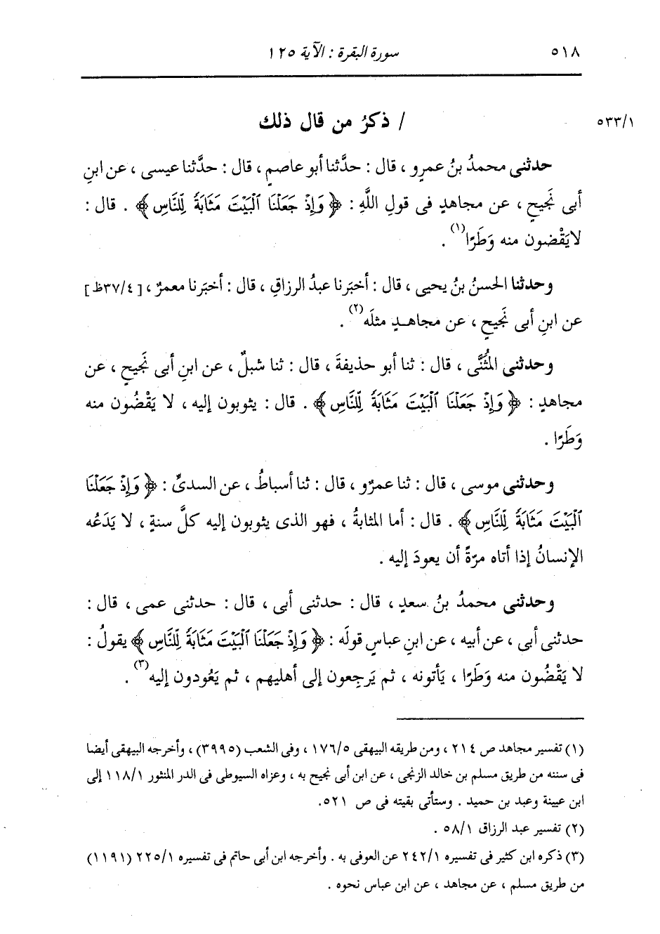 ذِكْرُ مَنْ قَالَ ذَلِكَ حَدَّثَنِي مُحَمَّدُ بْنُ عَمْرٍو، قَالَ: ثَنَا أَبُو عَاصِمٍ، عَنْ عِيسَى، عَنِ ابْنِ أَبِي نَجِيحٍ، عَنْ مُجَاهِدٍ: " فِي قَوْلِ اللَّهِ: {§وَإِذْ جَعَلْنَا الْبَيْتَ مَثَابَةً لِلنَّاسِ} [البقرة: 125] قَالَ: لَا يَقْضُونَ مِنْهُ وَطَرًا " حَدَّثَنَا الْحَسَنُ بْنُ يَحْيَى قَالَ: أَخْبَرَنَا عَبْدُ الرَّزَّاقِ قَالَ: أَخْبَرَنَا مَعْمَرٌ، عَنِ ابْنِ أَبِي نَجِيحٍ، عَنْ مُجَاهِدٍ، مِثْلَهُ