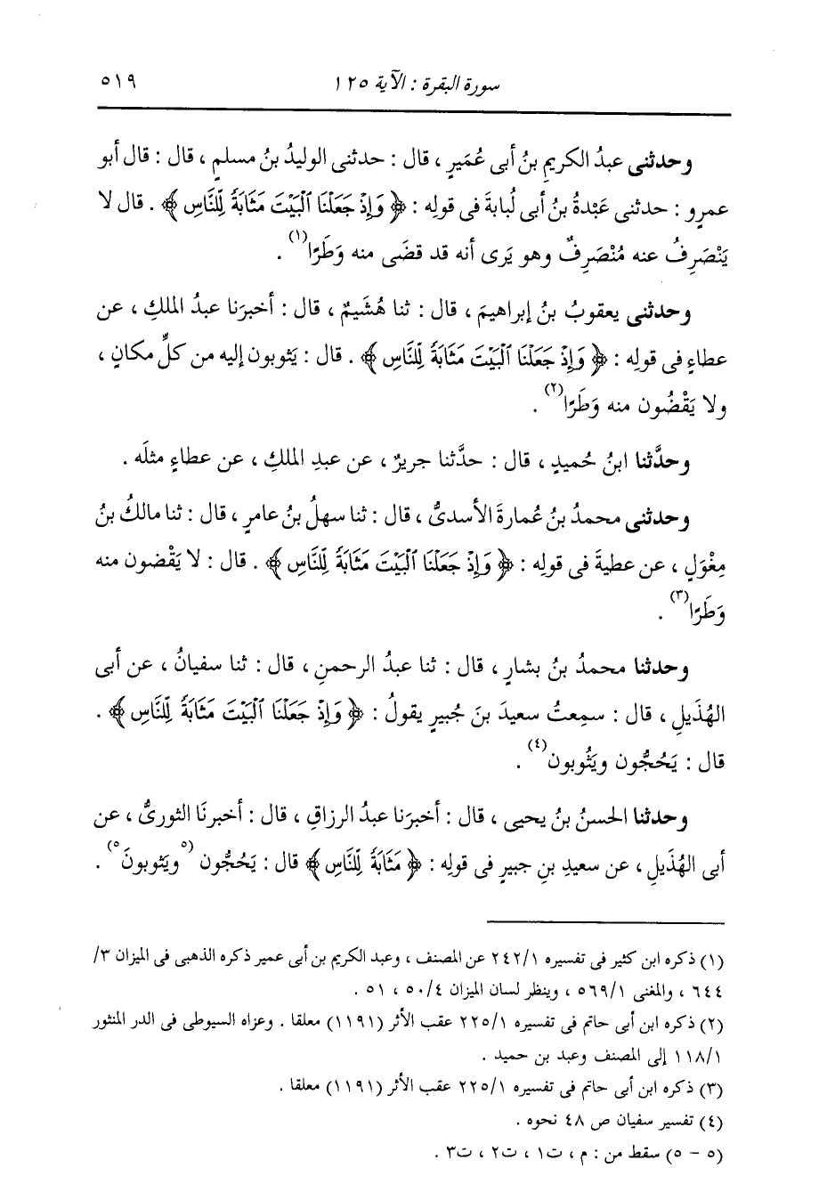 حَدَّثَنِي يَعْقُوبُ بْنُ إِبْرَاهِيمَ، قَالَ: ثَنَا هُشَيْمٌ، قَالَ: أَخْبَرَنَا عَبْدُ الْمَلِكِ، عَنْ عَطَاءٍ: " فِي قَوْلِهِ: {§وَإِذْ جَعَلْنَا الْبَيْتَ مَثَابَةً لِلنَّاسِ} [البقرة: 125] قَالَ: يَثُوبُونَ إِلَيْهِ مِنْ كُلِّ مَكَانٍ، وَلَا يَقْضُونَ مِنْهُ وَطَرًا " حَدَّثَنَا ابْنُ حُمَيْدٍ قَالَ: ثَنَا جَرِيرٌ، عَنْ عَبْدِ الْمَلِكِ، عَنْ عَطَاءٍ، مِثْلَهُ