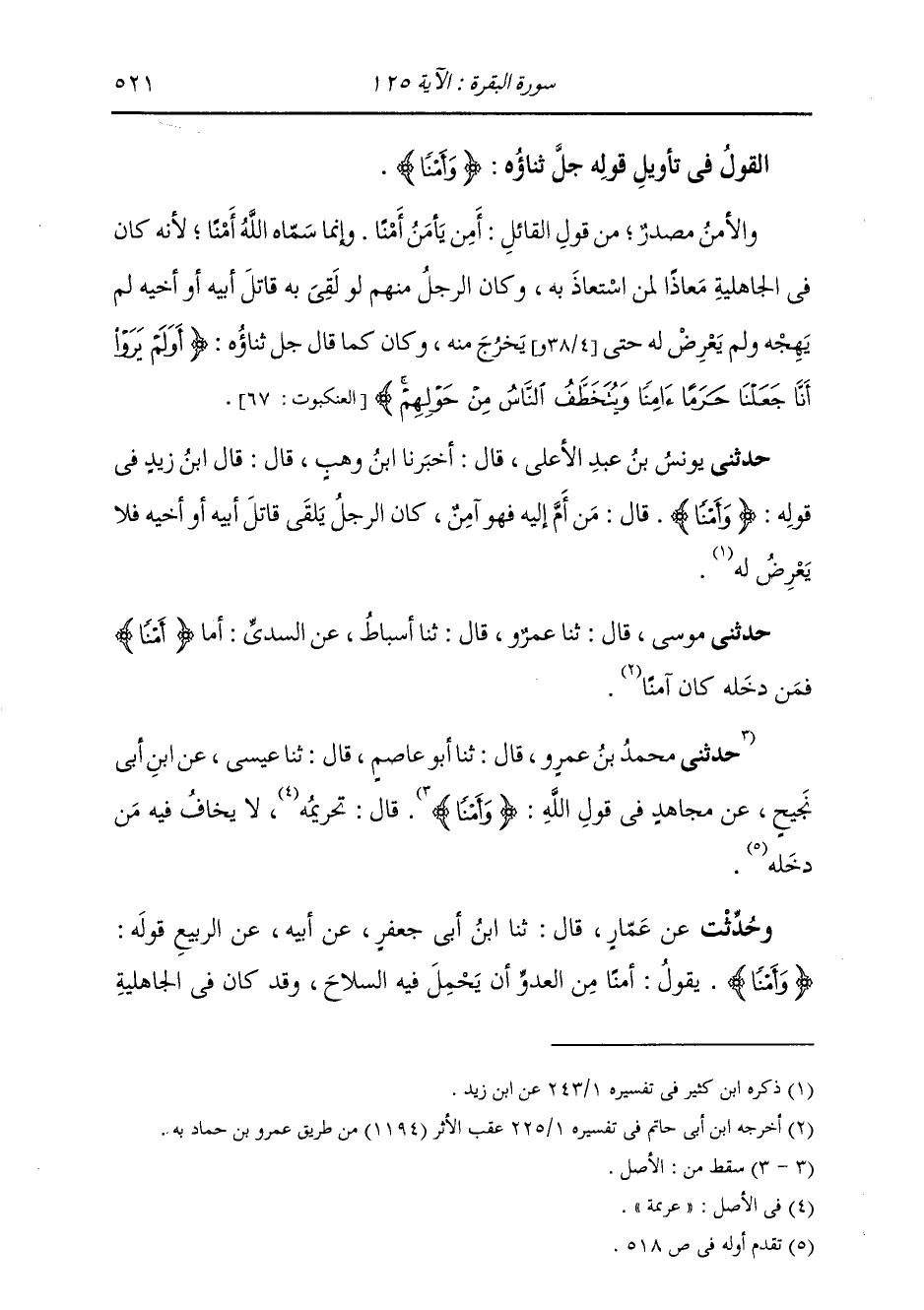 §الْقَوْلُ فِي تَأْوِيلِ قَوْلِهِ تَعَالَى: {وَأَمْنًا} [البقرة: 125] وَالْأَمْنَ: مَصْدَرٌ مِنْ قَوْلِ الْقَائِلِ أَمِنَ يَأْمَنُ أَمْنًا وَإِنَّمَا سَمَّاهُ اللَّهُ أَمْنًا لِأَنَّهُ كَانَ فِي الْجَاهِلِيَّةِ مَعَاذًا لِمَنِ اسْتَعَاذَ بِهِ، وَكَانَ الرَّجُلُ مِنْهُمْ لَوْ لَقِيَ بِهِ قَاتَلَ أَبِيهِ أَوْ أَخِيهِ لَمْ يَهْجُهُ وَلَمْ يَعْرِضْ لَهُ حَتَّى يَخْرُجَ مِنْهُ، وَكَانَ كَمَا قَالَ اللَّهُ جَلَّ ثَنَاؤُهُ: {أَوَلَمْ يَرَوْا أَنَّا جَعَلْنَا حَرَمًا آمِنًا وَيُتَخَطَّفُ النَّاسُ مِنْ حَوْلِهِمْ} [العنكبوت: 67]