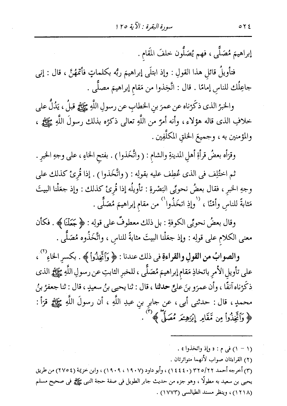 إِبْرَاهِيمَ مُصَلًّى، فَهُمْ يُصَلُّونَ خَلْفَ الْمَقَامِ " فَتَأْوِيلُ قَائِلِ هَذَا الْقَوْلِ: {وَإِذِ ابْتَلَى إِبْرَاهِيمَ رَبُّهُ بِكَلِمَاتٍ فَأَتَمَّهُنَّ قَالَ إِنِّي جَاعِلُكَ لِلنَّاسِ إِمَامًا} [البقرة: 124] وَقَالَ: {وَاتَّخِذُوا مِنْ مَقَامِ إِبْرَاهِيمَ مُصَلًّى} [البقرة: 125] وَالْخَبَرُ الَّذِي ذَكَرْنَاهُ عَنْ عُمَرَ بْنِ الْخَطَّابِ، عَنْ رَسُولِ اللَّهِ صَلَّى اللهُ عَلَيْهِ وَسَلَّمَ قَبْلَ، يَدُلُّ عَلَى خِلَافِ الَّذِي قَالَهُ هَؤُلَاءِ، وَأَنَّهُ أَمْرٌ مِنَ اللَّهِ تَعَالَى ذِكْرُهُ بِذَلِكَ رَسُولَ اللَّهِ صَلَّى اللهُ عَلَيْهِ وَسَلَّمَ وَالْمُؤْمِنِينَ بِهِ وَجَمِيعَ الْخَلْقِ الْمُكَلَّفِينَ. وَقَرَأَهُ بَعْضُ قُرَّاءِ أَهْلِ الْمَدِينَةِ وَالشَّامِ: (وَاتَّخَذُوا) بِفَتْحِ الْخَاءِ عَلَى وَجْهِ الْخَبَرِ. ثُمَّ اخْتُلِفَ فِي الَّذِي عُطِفَ عَلَيْهِ بِقَوْلِهِ: (وَاتَّخَذُوا) إِذَا قُرِئَ كَذَلِكَ عَلَى وَجْهِ الْخَبَرِ، فَقَالَ بَعْضُ نَحْوِيِّي الْبَصْرَةِ: تَأْوِيلُهُ إِذَا قُرِئَ كَذَلِكَ: وَإِذْ جَعَلْنَا الْبَيْتَ مَثَابَةً لِلنَّاسِ وَأَمْنًا وَإِذِ اتَّخَذُوا مِنْ مَقَامِ إِبْرَاهِيمَ مُصَلًّى. وَقَالَ بَعْضُ نَحْوِيِّي الْكُوفَةِ: بَلْ ذَلِكَ مَعْطُوفٌ عَلَى قَوْلِهِ: {جَعَلْنَا} [البقرة: 125] فَكَانَ مَعْنَى الْكَلَامِ عَلَى قَوْلِهِ: وَإِذْ جَعَلْنَا الْبَيْتَ مَثَابَةً لِلنَّاسِ وَاتَّخِذُوهُ مُصَلًّى. وَالصَّوَابُ مِنَ الْقَوْلِ وَالْقِرَاءَةِ فِي ذَلِكَ عِنْدَنَا: {وَاتَّخِذُوا} [البقرة: 125] بِكَسْرِ الْخَاءِ، عَلَى تَأْوِيلِ الْأَمْرِ بِاتِّخَاذِ مَقَامِ إِبْرَاهِيمَ مُصَلًّى؛ لِلْخَبَرِ الثَّابِتِ عَنْ رَسُولِ اللَّهِ صَلَّى اللهُ عَلَيْهِ وَسَلَّمَ الَّذِي ذَكَرْنَاهُ آنِفًا