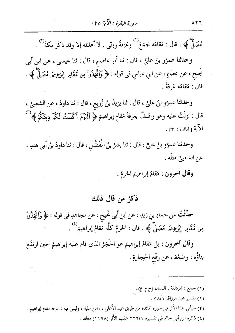 حَدَّثَنَا عَمْرُو بْنُ عَلِيٍّ، قَالَ: ثَنَا أَبُو عَاصِمٍ، قَالَ: ثَنَا عِيسَى، عَنِ ابْنِ أَبِي نَجِيحٍ، عَنْ عَطَاءٍ، عَنِ ابْنِ عَبَّاسٍ: " فِي قَوْلِهِ: {§وَاتَّخِذُوا مِنْ مَقَامِ إِبْرَاهِيمَ مُصَلًّى} [البقرة: 125] قَالَ: مَقَامُهُ عَرَفَةُ "