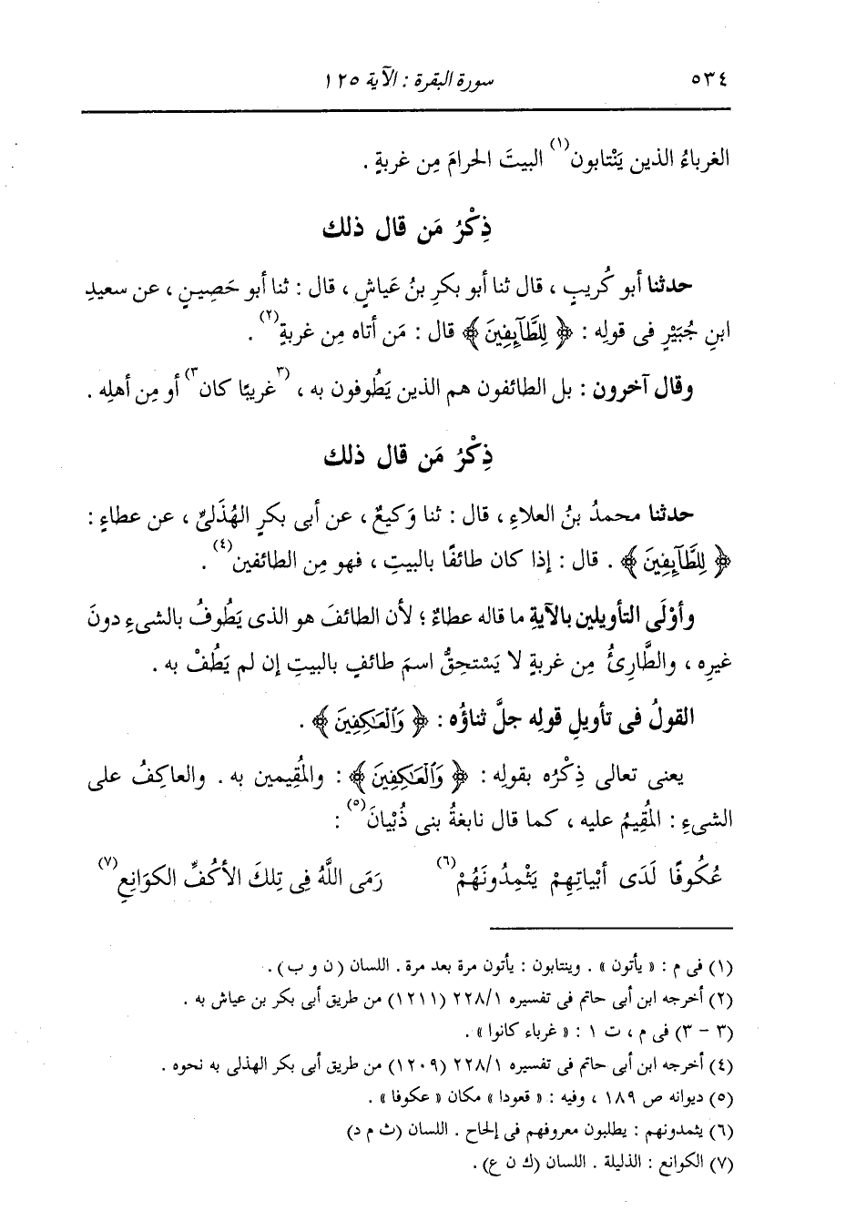 ذِكْرُ مَنْ قَالَ ذَلِكَ حَدَّثَنَا أَبُو كُرَيْبٍ، قَالَ: ثَنَا أَبُو بَكْرِ بْنُ عَيَّاشٍ، قَالَ: ثَنَا أَبُو حُصَيْنٍ، عَنْ سَعِيدِ بْنِ جُبَيْرٍ: " فِي قَوْلِهِ: {§لِلطَّائِفِينَ} [البقرة: 125] قَالَ: مَنْ أَتَاهُ مِنْ غُرْبَةٍ " وَقَالَ آخَرُونَ: بَلِ الطَّائِفُونَ هُمُ الَّذِينَ يَطُوفُونَ بِهِ غُرَبَاءَ كَانُوا أَوْ مِنْ أَهْلِهِ