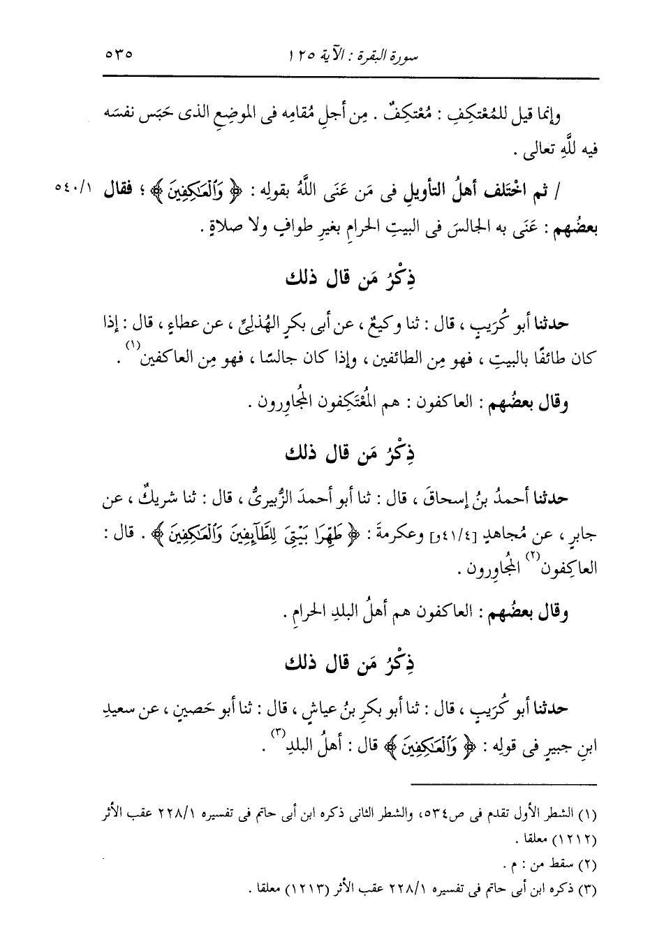 ذِكْرُ مَنْ قَالَ ذَلِكَ حَدَّثَنَا أَبُو كُرَيْبٍ، قَالَ: ثَنَا أَبُو بَكْرِ بْنُ عَيَّاشٍ، قَالَ: ثَنَا أَبُو حُصَيْنٍ، عَنْ سَعِيدِ بْنِ جُبَيْرٍ: " فِي قَوْلِهِ: {§وَالْعَاكِفِينَ} [البقرة: 125] قَالَ: أَهْلُ الْبَلَدِ "