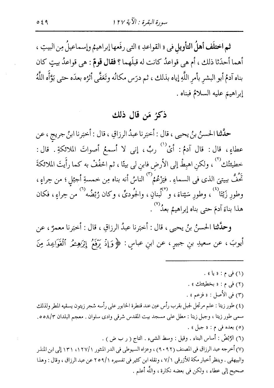 حَدَّثَنَا الْحَسَنُ بْنُ يَحْيَى، قَالَ: أَخْبَرَنَا عَبْدُ الرَّزَّاقِ، قَالَ: أَخْبَرَنَا مَعْمَرٌ، عَنْ أَيُّوبَ، عَنْ سَعِيدِ بْنِ جُبَيْرٍ، عَنِ ابْنِ عَبَّاسٍ: " {§وَإِذْ يَرْفَعُ إِبْرَاهِيمُ الْقَوَاعِدَ مِنَ -[550]- الْبَيْتِ} [البقرة: 127] قَالَ: الْقَوَاعِدُ الَّتِي كَانَتْ قَوَاعِدَ الْبَيْتِ قَبْلَ ذَلِكَ " وَقَالَ آخَرُونَ: بَلْ هِيَ قَوَاعِدُ بَيْتٍ كَانَ اللَّهُ أَهْبَطَهُ لِآدَمَ مِنَ السَّمَاءِ إِلَى الْأَرْضِ، يَطُوفُ بِهِ كَمَا كَانَ يَطُوفُ بِعَرْشِهِ فِي السَّمَاءِ، ثُمَّ رَفَعَهُ إِلَى السَّمَاءِ أَيَّامَ الطُّوفَانِ، فَرَفَعَ إِبْرَاهِيمُ قَوَاعِدَ ذَلِكَ الْبَيْتِ