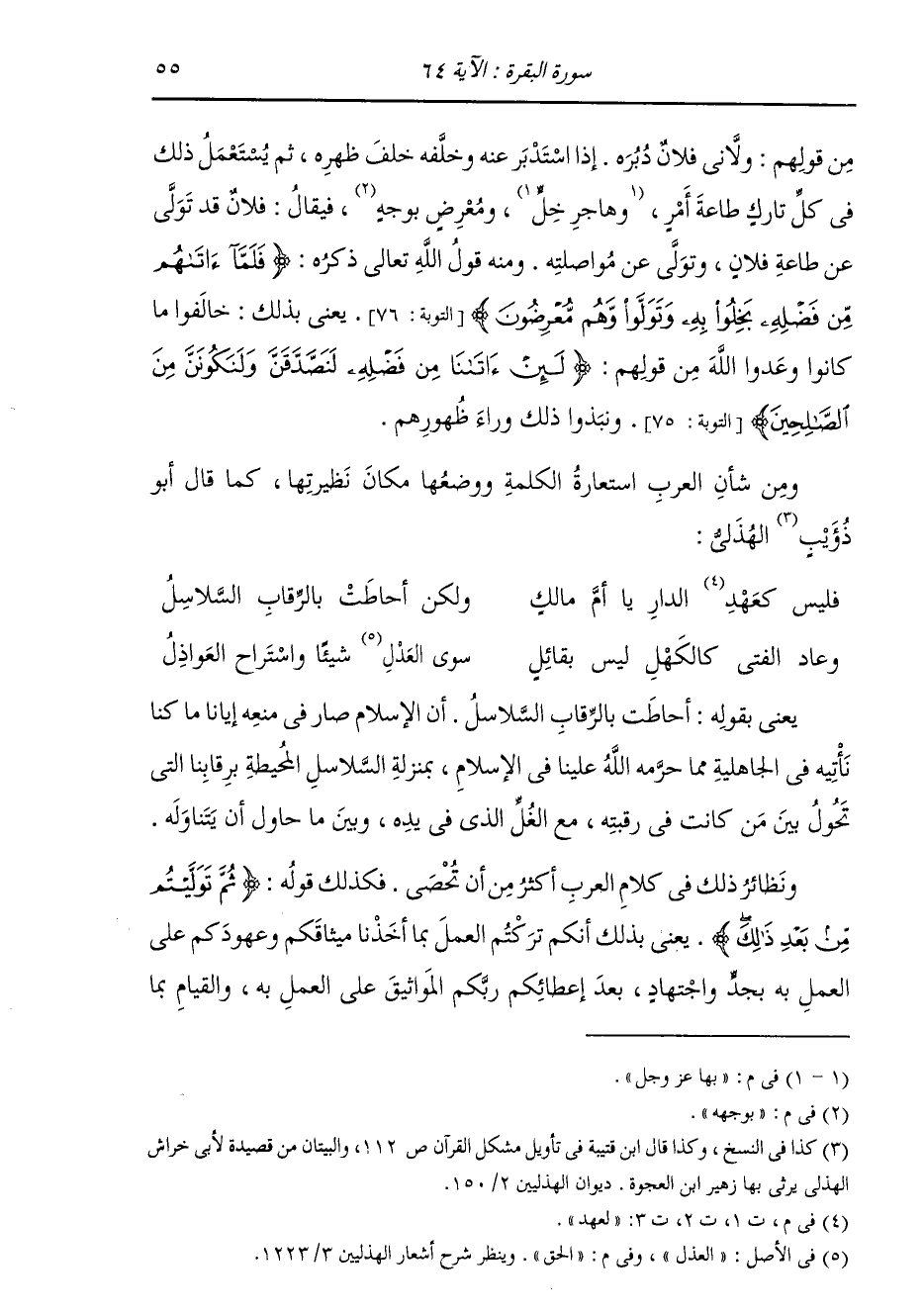 مِنْ قَوْلِهِمْ: وَلَّانِي فُلَانٌ دُبُرَهُ: إِذَا اسْتَدْبَرَ عَنْهُ وَخَلَّفَهُ خَلْفَ ظَهْرِهِ، ثُمَّ يَسْتَعْمِلُ ذَلِكَ فِي كُلِّ تَارِكٍ طَاعَةَ أَمَرَ بِهَا عَزَّ وَجَلَّ مُعْرِضٍ بِوَجْهِهِ، يُقَالُ: قَدْ تَوَلَّى فُلَانٌ عَنْ طَاعَةِ فُلَانٍ، وَتَوَلَّى عَنْ مُوَاصَلَتِهِ، وَمِنْهُ قَوْلُ اللَّهِ جَلَّ ثَنَاؤُهُ: {فَلَمَّا آتَاهُمْ مِنْ فَضْلِهِ بَخِلُوا بِهِ وَتَوَلَّوْا وَهُمْ مُعْرِضُونَ} [التوبة: 76] يَعْنِي بِذَلِكَ: خَالَفُوا مَا كَانُوا وَعَدُوا اللَّهَ مِنْ قَوْلِهِمْ: {لَئِنْ آتَانَا مِنْ فَضْلِهِ لَنَصَّدَّقَنَّ وَلَنَكُونَنَّ مِنَ الصَّالِحِينَ} [التوبة: 75] وَنَبَذُوا ذَلِكَ وَرَاءَ ظُهُورِهِمْ، وَمِنْ شَأْنِ الْعَرَبِ اسْتِعَارَةُ الْكَلِمَةِ وَوَضْعُهَا مَكَانَ نَظِيرِهَا، كَمَا قَالَ أَبُو ذُؤَيْبٍ الْهُذَلِيُّ: