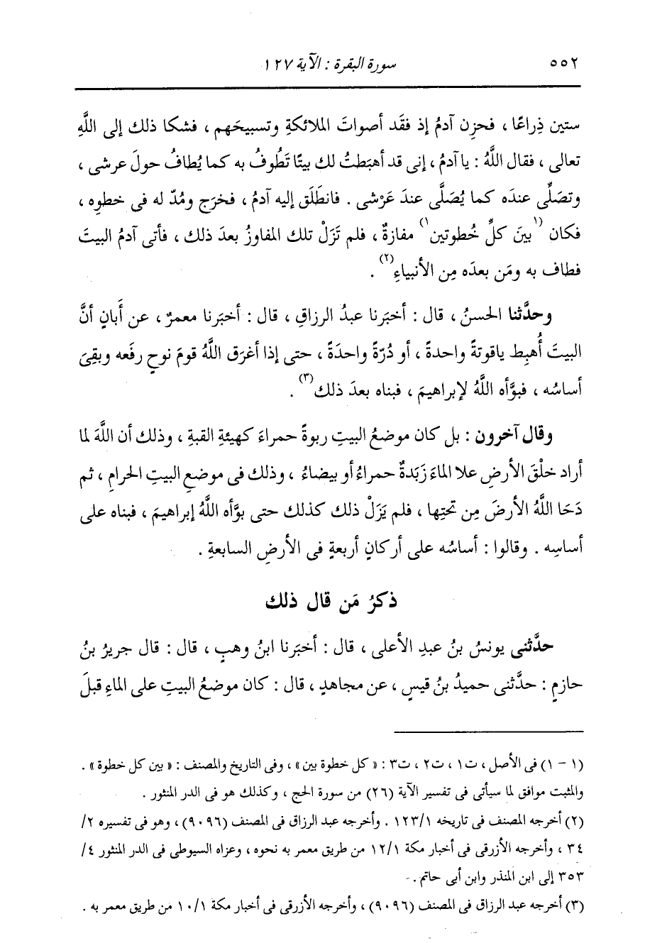 حَدَّثَنَا الْحَسَنُ بْنُ يَحْيَى، قَالَ: أَخْبَرَنَا عَبْدُ الرَّزَّاقِ، قَالَ: أَخْبَرَنَا مَعْمَرٌ، عَنْ أَبَانَ: «أَنَّ §الْبَيْتَ، أُهْبِطَ يَاقُوتَةً وَاحِدَةً أَوْ دُرَّةً وَاحِدَةً، حَتَّى إِذَا أَغْرَقَ اللَّهُ قَوْمَ نُوحٍ رَفَعَهُ وَبَقِيَ أَسَاسُهُ، فَبَوَّأَهُ اللَّهُ لِإِبْرَاهِيمَ، فَبَنَاهُ بَعْدَ ذَلِكَ» وَقَالَ آخَرُونَ: بَلْ كَانَ مَوْضِعُ الْبَيْتِ رَبْوَةً حَمْرَاءَ كَهَيْئَةِ الْقُبَّةِ. وَذَلِكَ أَنَّ اللَّهَ لَمَّا أَرَادَ خَلْقَ الْأَرْضِ عَلَا الْمَاءَ زَبْدَةٌ حَمْرَاءُ أَوْ بَيْضَاءُ، وَذَلِكَ فِي مَوْضِعِ الْبَيْتِ الْحَرَامِ، ثُمَّ دَحَا الْأَرْضَ مِنْ تَحْتِهَا، فَلَمْ يَزَلْ ذَلِكَ كَذَلِكَ حَتَّى بَوَّأَهُ اللَّهُ إِبْرَاهِيمَ، فَبَنَاهُ عَلَى أَسَاسِهِ. وَقَالُوا: عَلَى أَرْكَانِ أَرْبَعَةٍ فِي الْأَرْضِ السَّابِعَةِ