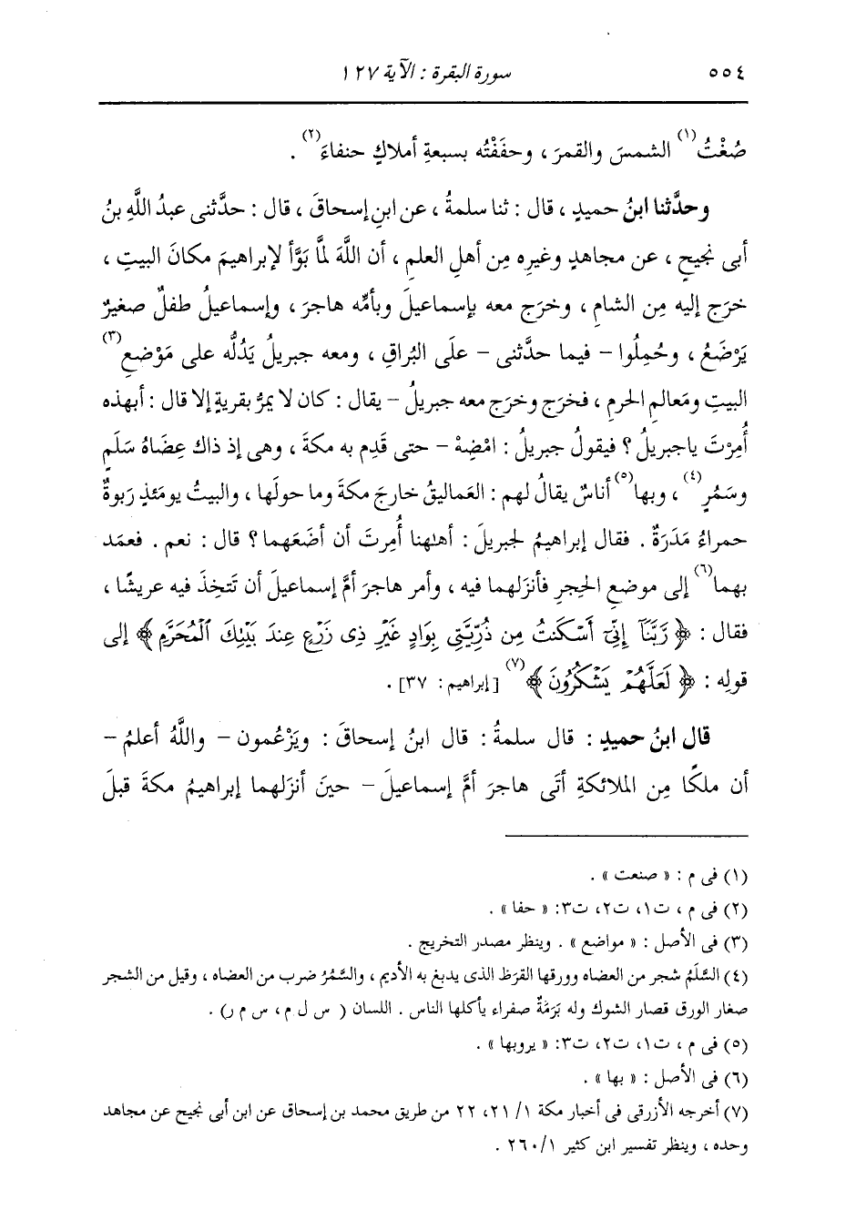 حَدَّثَنَا ابْنُ حُمَيْدٍ، قَالَ: ثَنَا سَلَمَةُ، عَنِ ابْنِ إِسْحَاقَ، قَالَ: حَدَّثَنِي عَبْدُ اللَّهِ بْنُ أَبِي يَحْيَى، عَنْ مُجَاهِدٍ، وَغَيْرُهُ، مِنْ أَهْلِ الْعِلْمِ: " §أَنَّ اللَّهَ لَمَّا بَوَّأَ إِبْرَاهِيمَ مَكَانَ الْبَيْتِ، خَرَجَ إِلَيْهِ مِنَ الشَّامِ، وَخَرَجَ مَعَهُ بِإِسْمَاعِيلَ وَأُمِّهِ هَاجَرَ، وَإِسْمَاعِيلُ طِفْلٌ صَغِيرٌ يَرْضَعُ، وَحَمَلُوا - فِيمَا حَدَّثَنِي - عَلَى الْبُرَاقِ وَمَعَهُ جِبْرِيلُ يَدُلُّهُ عَلَى مَوْضِعِ الْبَيْتِ وَمَعَالِمِ الْحَرَمِ. فَخَرَجَ وَخَرَجَ مَعَهُ جِبْرِيلُ، فَقَالَ: كَانَ لَا يَمُرُّ بِقَرْيَةٍ إِلَّا قَالَ: أَبِهَذِهِ أُمِرْتُ يَا جِبْرِيلُ؟ فَيَقُولُ جِبْرِيلُ: امْضِهْ. حَتَّى قَدِمَ بِهِ مَكَّةَ، وَهِيَ إِذْ ذَاكَ عِضَاهُ سَلَمٍ وَسَمُرٍ يَرُبُّهَا أُنَاسٌ يُقَالُ لَهُمُ الْعَمَالِيقُ خَارِجَ مَكَّةَ وَمَا حَوْلَهَا، وَالْبَيْتُ يَوْمَئِذٍ رَبْوَةٌ حَمْرَاءُ مَدَرَةٌ، فَقَالَ إِبْرَاهِيمُ لِجِبْرِيلَ: أَهَهُنَا أُمِرْتَ أَنْ أَضَعَهُمَا؟ قَالَ: نَعَمْ. فَعَمَدَ بِهِمَا إِلَى مَوْضِعِ الْحَجَرِ فَأَنْزَلَهُمَا فِيهِ، وَأَمَرَ هَاجَرَ أُمَّ إِسْمَاعِيلَ أَنْ تَتَّخِذَ فِيهِ عَرِيشًا، فَقَالَ: {رَبَّنَا إِنِّي أَسْكَنْتُ مِنْ ذُرِّيَّتِي بِوَادٍ غَيْرِ ذِي زَرْعٍ عِنْدَ بَيْتِكَ الْمُحَرَّمِ} [إبراهيم: 37] إِلَى قَوْلِهِ: {لَعَلَّهُمْ يَشْكُرُونَ} [إبراهيم: 37] "