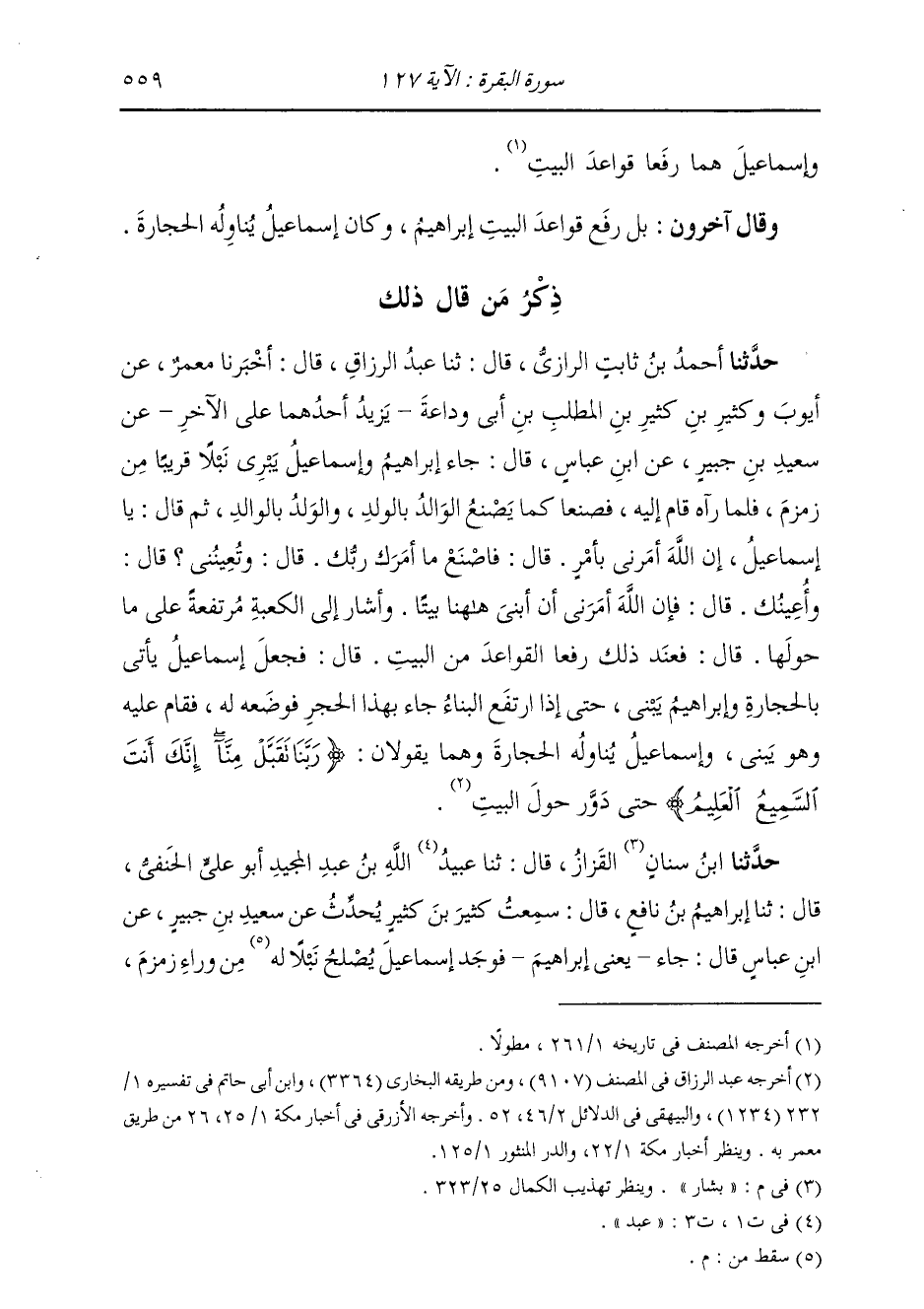 ذِكْرُ مَنْ قَالَ ذَلِكَ حَدَّثَنَا أَحْمَدُ بْنُ ثَابِتٍ الرَّازِيُّ، قَالَ: ثَنَا عَبْدُ الرَّزَّاقِ، قَالَ: أَخْبَرَنَا مَعْمَرٌ، عَنْ أَيُّوبَ، وَكَثِيرُ بْنُ كَثِيرِ بْنِ الْمُطَّلِبِ بْنِ أَبِي وَدَاعَةَ، يَزِيدُ أَحَدُهُمَا عَلَى الْآخَرِ، عَنْ سَعِيدِ بْنِ جُبَيْرٍ، عَنِ ابْنِ عَبَّاسٍ، قَالَ: " §جَاءَ إِبْرَاهِيمُ وَإِسْمَاعِيلُ يَبْرِي نَبْلًا قَرِيبًا مِنْ زَمْزَمَ. فَلَمَّا رَآهُ قَامَ إِلَيْهِ، فَصَنَعَا كَمَا يَصْنَعُ الْوَالِدُ بِالْوَلَدِ، وَالْوَلَدُ بِالْوَالِدِ، ثُمَّ، قَالَ: يَا إِسْمَاعِيلُ إِنَّ اللَّهَ أَمَرَنِي بِأَمْرٍ، قَالَ: فَاصْنَعْ مَا أَمَرَكَ رَبُّكَ، قَالَ: وَتُعِينُنِي؟ قَالَ: وَأُعِينُكَ، قَالَ: فَإِنَّ اللَّهَ أَمَرَنِي أَنْ أَبْنِيَ هَا هُنَا بَيْتًا. وَأَشَارَ إِلَى الْكَعْبَةِ، وَالْكَعْبَةُ مُرْتَفِعَةٌ عَلَى مَا حَوْلَهَا، قَالَ: فَعِنْدَ ذَلِكَ رَفَعَا الْقَوَاعِدَ مِنَ الْبَيْتِ، قَالَ: فَجَعَلَ إِسْمَاعِيلُ يَأْتِي بِالْحِجَارَةِ، وَإِبْرَاهِيمُ يَبْنِي، حَتَّى إِذَا ارْتَفَعَ الْبِنَاءُ جَاءَ بِهَذَا الْحَجَرِ فَوَضَعَهُ لَهُ، فَقَامَ عَلَيْهِ وَهُوَ يَبْنِي، وَإِسْمَاعِيلُ يُنَاوِلُهُ الْحِجَارَةَ وَهُمَا يَقُولَانِ: {رَبَّنَا تَقَبَّلْ مِنَّا إِنَّكَ أَنْتَ السَّمِيعُ الْعَلِيمُ} [البقرة: 127] حَتَّى دَوَّرَ حَوْلَ الْبَيْتِ "