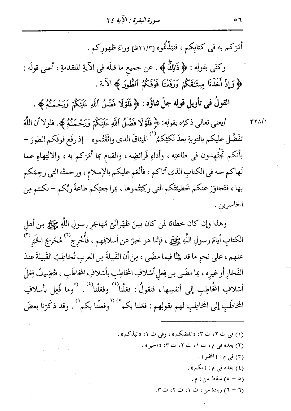 §الْقَوْلُ فِي تَأْوِيلِ قَوْلِهِ تَعَالَى: {فَلَوْلَا فَضْلُ اللَّهِ عَلَيْكُمْ وَرَحْمَتُهُ} [البقرة: 64] قَالَ أَبُو جَعْفَرٍ: يَعْنِي بِقَوْلِهِ جَلَّ ذِكْرُهُ: {فَلَوْلَا فَضْلُ اللَّهِ عَلَيْكُمْ} [البقرة: 64] فَلَوْلَا أَنَّ اللَّهَ تَفَضَّلَ عَلَيْكُمْ بِالتَّوْبَةِ بَعْدَ نَكْثِكُمُ الْمِيثَاقَ الَّذِي وَاثَقْتُمُوهُ، إِذْ رَفَعَ فَوْقَكُمُ الطُّورَ، بِأَنَّكُمْ تَجْتَهِدُونَ فِي طَاعَتِهِ، وَأَدَاءِ فَرَائِضِهِ، وَالْقِيَامِ بِمَا أَمَرَكُمْ بِهِ، وَالِانْتِهَاءِ عَمَّا نَهَاكُمْ عَنْهُ فِي الْكِتَابِ الَّذِي آتَاكُمْ، فَأَنْعَمَ عَلَيْكُمْ بِالْإِسْلَامِ وَرَحْمَتِهِ الَّتِي رَحِمَكُمْ بِهَا، وَتَجَاوَزَ عَنْكُمْ خَطِيئَتَكُمُ الَّتِي رَكِبْتُمُوهَا بِمُرَاجَعَتِكُمْ طَاعَةَ رَبِّكُمْ؛ لَكُنْتُمْ مِنَ الْخَاسِرِينَ. وَهَذَا وَإِنْ كَانَ خِطَابًا لِمَنْ كَانَ بَيْنَ ظَهْرَانَيْ مُهَاجَرِ رَسُولِ اللَّهِ صَلَّى اللهُ عَلَيْهِ وَسَلَّمَ مِنْ أَهْلِ الْكِتَابِ أَيَّامَ رَسُولِ اللَّهِ صَلَّى اللهُ عَلَيْهِ وَسَلَّمَ، فَإِنَّمَا هُوَ خَبَرٌ عَنْ أَسْلَافِهِمْ، فَأَخْرَجَ الْخَبَرَ مَخْرَجَ الْمُخْبَرِ عَنْهُمْ عَلَى نَحْوِ مَا قَدْ بَيَّنَّا فِيمَا مَضَى مِنْ أَنَّ الْقَبِيلَةَ مِنَ الْعَرَبِ تُخَاطِبُ الْقَبِيلَةَ عِنْدَ الْفَخَارِ أَوْ غَيْرِهِ بِمَا مَضَى مِنْ فِعْلِ أَسْلَافِ الْمُخَاطِبِ بِأَسْلَافِ الْمُخَاطَبِ، فَتُضِيفُ فِعْلَ أَسْلَافِ الْمُخَاطِبِ إِلَى نَفْسِهَا، فَتَقُولُ: فَعَلْنَا بِكُمْ، وَفَعَلْنَا بِكُمْ. وَقَدْ ذَكَرْنَا بَعْضَ