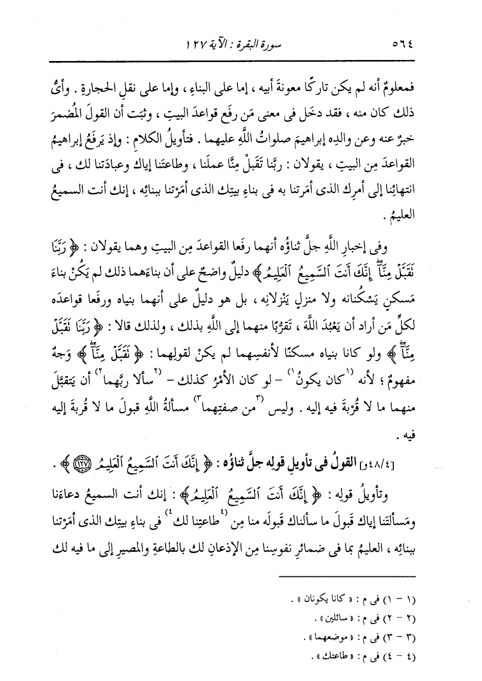 §الْقَوْلُ فِي تَأْوِيلِ قَوْلِهِ تَعَالَى: {إِنَّكَ أَنْتَ السَّمِيعُ الْعَلِيمُ} [البقرة: 127] وَتَأْوِيلُ قَوْلِهِ: {إِنَّكَ أَنْتَ السَّمِيعُ الْعَلِيمُ} [البقرة: 127] إِنَّكَ أَنْتَ السَّمِيعُ دُعَاءَنَا وَمَسْأَلَتَنَا إِيَّاكَ قَبُولَ مَا سَأَلْنَاكَ قَبُولَهُ مِنَّا مِنْ طَاعَتِكَ فِي بِنَاءِ بَيْتِكَ الَّذِي أَمَرْتَنَا بِبِنَائِهِ؛ الْعَلِيمُ بِمَا فِي ضَمَائِرِ نُفُوسِنَا مِنَ الْإِذْعَانِ لَكَ فِي الطَّاعَةِ وَالْمَصِيرِ إِلَى مَا فِيهِ لَكَ -[565]- الرِّضَا وَالْمَحَبَّةُ، وَمَا نُبْدِي وَنُخْفِي مِنْ أَعْمَالِنَا