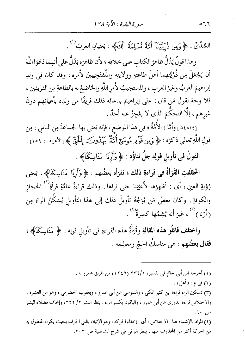 §الْقَوْلُ فِي تَأْوِيلِ قَوْلِهِ تَعَالَى: {وَأَرِنَا مَنَاسِكَنَا} [البقرة: 128] اخْتَلَفَتِ الْقُرَّاءُ فِي قِرَاءَةِ ذَلِكَ، فَقَرَأَهُ بَعْضُهُمْ: {وَأَرِنَا مَنَاسِكَنَا} [البقرة: 128] بِمَعْنَى رُؤْيَةِ الْعَيْنِ، أَيْ أَظْهِرْهَا لَأَعْيُنِنَا حَتَّى نَرَاهَا. وَذَلِكَ قِرَاءَةُ عَامَّةِ أَهْلِ الْحِجَازِ وَالْكُوفَةِ، وَكَانَ بَعْضُ مَنْ يُوَجِّهُ تَأْوِيلَ ذَلِكَ إِلَى هَذَا التَّأْوِيلِ يُسَكِّنُ الرَّاءَ مِنْ «أَرِنَا» ، غَيْرَ أَنَّهُ يُشِمُّهَا كَسْرَةً. وَاخْتَلَفَ قَائِلُ هَذِهِ الْمَقَالَةِ وَقُرَّاءُ هَذِهِ الْقِرَاءَةِ فِي تَأْوِيلِ قَوْلِهِ: {مَنَاسِكَنَا} [البقرة: 128] فَقَالَ بَعْضُهُمْ: هِيَ مَنَاسِكُ الْحَجِّ وَمَعَالِمُهُ