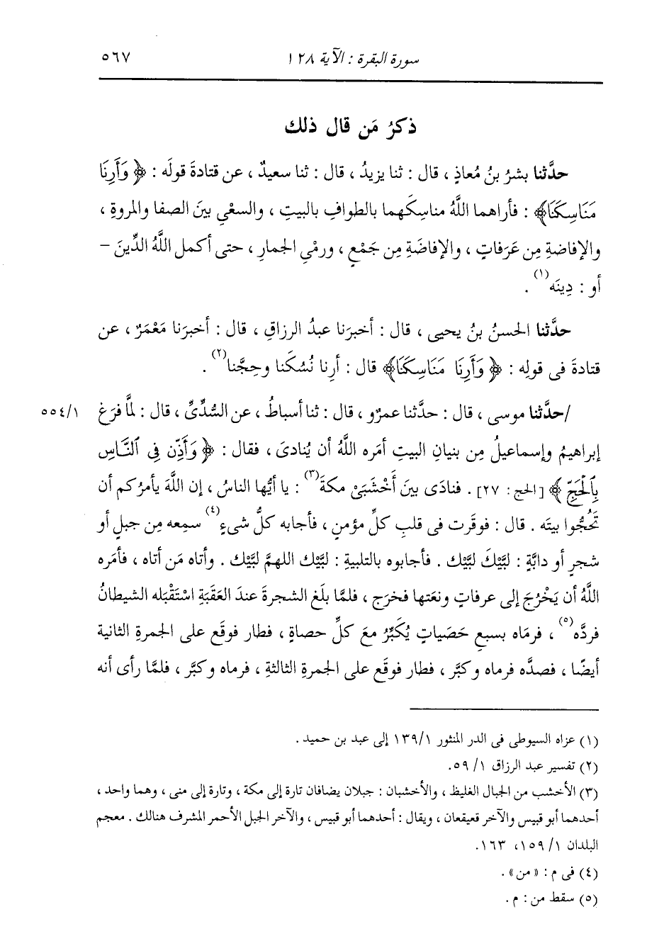 ذِكْرُ مَنْ قَالَ ذَلِكَ حَدَّثَنَا بِشْرُ بْنُ مُعَاذٍ، قَالَ: ثَنَا يَزِيدُ، قَالَ: ثَنَا سَعِيدٌ، عَنْ قَتَادَةَ: " قَوْلُهُ: {§وَأَرِنَا مَنَاسِكَنَا،} [البقرة: 128] فَأَرَاهُمَا اللَّهُ مَنَاسِكَهُمَا الطَّوَافَ بِالْبَيْتِ، وَالسَّعْيَ بَيْنَ الصَّفَا وَالْمَرْوَةِ، وَالْإِفَاضَةَ مِنْ عَرَفَاتٍ، وَالْإِفَاضَةَ مِنْ جَمْعٍ، وَرَمْيَ الْجِمَارِ، حَتَّى أَكْمَلَ اللَّهُ الدِّينَ أَوْ دِينَهُ "