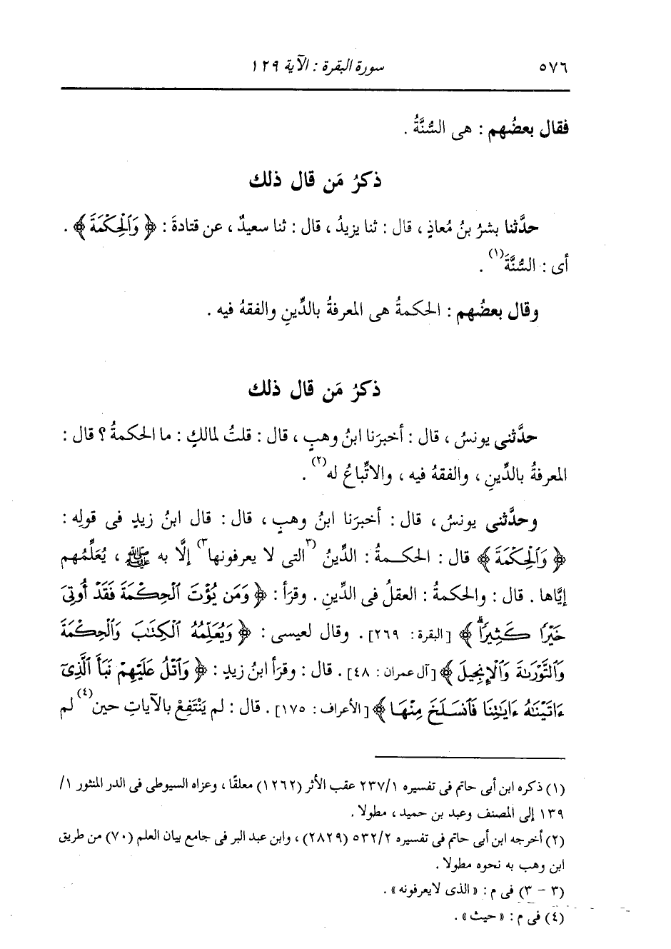 ذِكْرُ مَنْ قَالَ ذَلِكَ حَدَّثَنَا بِشْرُ بْنُ مُعَاذٍ، قَالَ: ثَنَا يَزِيدُ، قَالَ: ثَنَا سَعِيدٌ، عَنْ قَتَادَةَ: " {§وَالْحِكْمَةَ} [البقرة: 129] : أَيِ السُّنَّةَ " وَقَالَ بَعْضُهُمُ: الْحِكْمَةُ هِيَ الْمَعْرِفَةُ بِالدَّيْنِ وَالْفِقْهُ فِيهِ