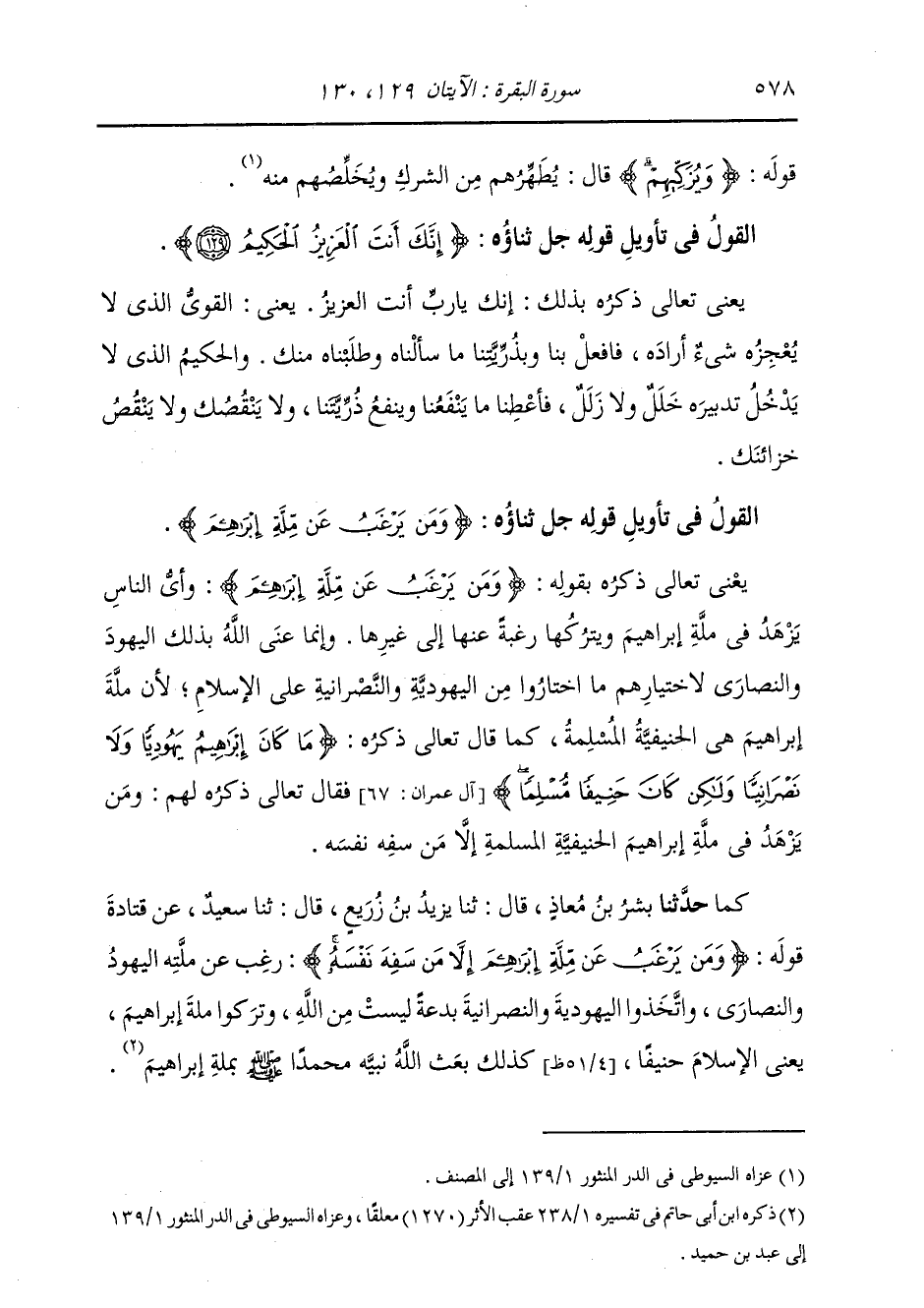 §يَعْنِي تَعَالَى ذِكْرُهُ بِقَوْلِهِ: {وَمَنْ يُرَغِّبُ عَنْ مِلَّةِ إِبْرَاهِيمَ} [البقرة: 130] وَأَيُّ النَّاسِ يَزْهَدُ فِي مِلَّةِ إِبْرَاهِيمَ وَيَتْرُكُهَا رَغْبَةً عَنْهَا إِلَى غَيْرَهَا. وَإِنَّمَا عَنَى اللَّهُ بِذَلِكَ الْيَهُودَ وَالنَّصَارَى لِاخْتِيَارِهِمْ مَا اخْتَارُوا مِنَ الْيَهُودِيَّةِ وَالنَّصْرَانِيَّةِ عَلَى الْإِسْلَامِ؛ لِأَنَّ مِلَّةَ إِبْرَاهِيمَ هِيَ الْحَنِيفِيَّةُ الْمُسْلِمَةُ، كَمَا قَالَ تَعَالَى ذِكْرُهُ: {مَا كَانَ إِبْرَاهِيمُ يَهُودِيًّا وَلَا نَصْرَانِيًّا وَلَكِنْ كَانَ حَنِيفًا مُسْلِمًا} [آل عمران: 67] فَقَالَ تَعَالَى ذِكْرُهُ لَهُمْ: وَمَنْ يَزْهَدُ عَنْ مِلَّةِ إِبْرَاهِيمَ الْحَنِيفِيَّةَ الْمُسْلِمَةَ إِلَّا مَنْ سَفِهَ نَفْسَهُ