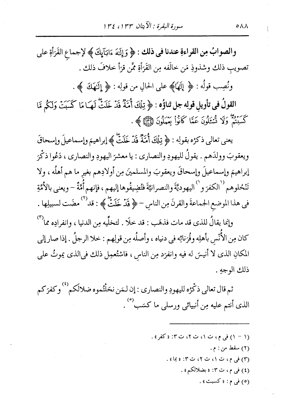 وَالصَّوَابُ مِنَ الْقِرَاءَةِ عِنْدَنَا فِي ذَلِكَ: {وَإِلَهَ آبَائِكَ} [البقرة: 133] لِإِجْمَاعِ الْقُرَّاءِ عَلَى تَصْوِيبِ ذَلِكَ وَشُذُوذِ مَنْ خَالَفَهُ مِنَ الْقُرَّاءِ مِمَّنْ قَرَأَ خِلَافَ ذَلِكَ، وَنَصَبَ قَوْلَهُ إِلَهًا عَلَى الْحَالِ مِنْ قَوْلِهِ إِلَهِكَ