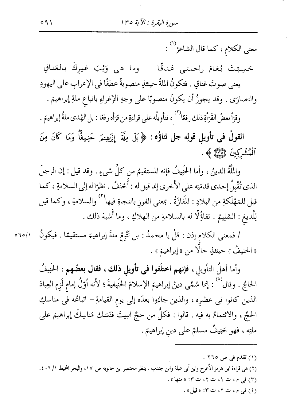 §الْقَوْلُ فِي تَأْوِيلِ قَوْلِهِ تَعَالَى: {بَلْ مِلَّةَ إِبْرَاهِيمَ حَنِيفًا} [البقرة: 135] الْمِلَّةُ: الدِّينُ. وَأَمَّا الْحَنِيفُ: فَإِنَّهُ الْمُسْتَقِيمُ مِنْ كُلِّ شَيْءٍ. وَقَدْ قِيلَ: إِنَّ الرَّجُلَ الَّذِي تُقْبِلُ إِحْدَى قَدَمَيْهِ عَلَى الْأُخْرَى إِنَّمَا قِيلَ لَهُ أَحْنَفُ نَظَرًا لَهُ إِلَى السَّلَامَةِ، كَمَا قِيلَ لِلْمَهْلَكَةِ مِنَ الْبِلَادِ: الْمَفَازَةُ، بِمَعْنَى الْفَوْزِ بِالنَّجَاةِ مِنْهَا وَالسَّلَامَةِ؛ وَكَمَا قِيلَ لِلَّدِيغِ: السَّلِيمُ، تَفَاؤُلًا لَهُ بِالسَّلَامَةِ مِنَ الْهَلَاكِ، وَمَا أَشْبَهَ ذَلِكَ. فَمَعْنَى الْكَلَامِ إِذًا: قُلْ يَا مُحَمَّدُ بَلْ نَتَّبِعُ مِلَّةَ إِبْرَاهِيمَ مُسْتَقِيمًا. فَيَكُونُ الْحَنِيفُ حِينَئِذٍ حَالًا مِنْ إِبْرَاهِيمَ وَأَمَّا أَهْلُ التَّأْوِيلِ فَإِنَّهُمُ اخْتَلَفُوا فِي تَأْوِيلِ ذَلِكَ، فَقَالَ بَعْضُهُمُ: الْحَنِيفُ: الْحَاجُّ. وَقِيلَ: إِنَّمَا سُمِّيَ دِينُ إِبْرَاهِيمَ الْإِسْلَامَ الْحَنِيفِيَّةَ، لِأَنَّهُ أَوَّلُ إِمَامٍ لَزِمَ الْعِبَادَ الَّذِينَ كَانُوا فِي عَصْرِهِ وَالَّذِينَ جَاءُوا بَعْدَهُ إِلَى يَوْمِ الْقِيَامَةِ اتِّبَاعُهُ فِي مَنَاسِكِ الْحَجِّ، وَالِائْتِمَامُ بِهِ فِيهِ. قَالُوا: فَكُلُّ مَنْ حَجَّ الْبَيْتَ فَنَسَكَ مَنَاسِكَ إِبْرَاهِيمَ عَلَى مِلَّتِهِ، فَهُوَ حُنَيْفٌ مُسْلِمٌ عَلَى دِينِ إِبْرَاهِيمَ